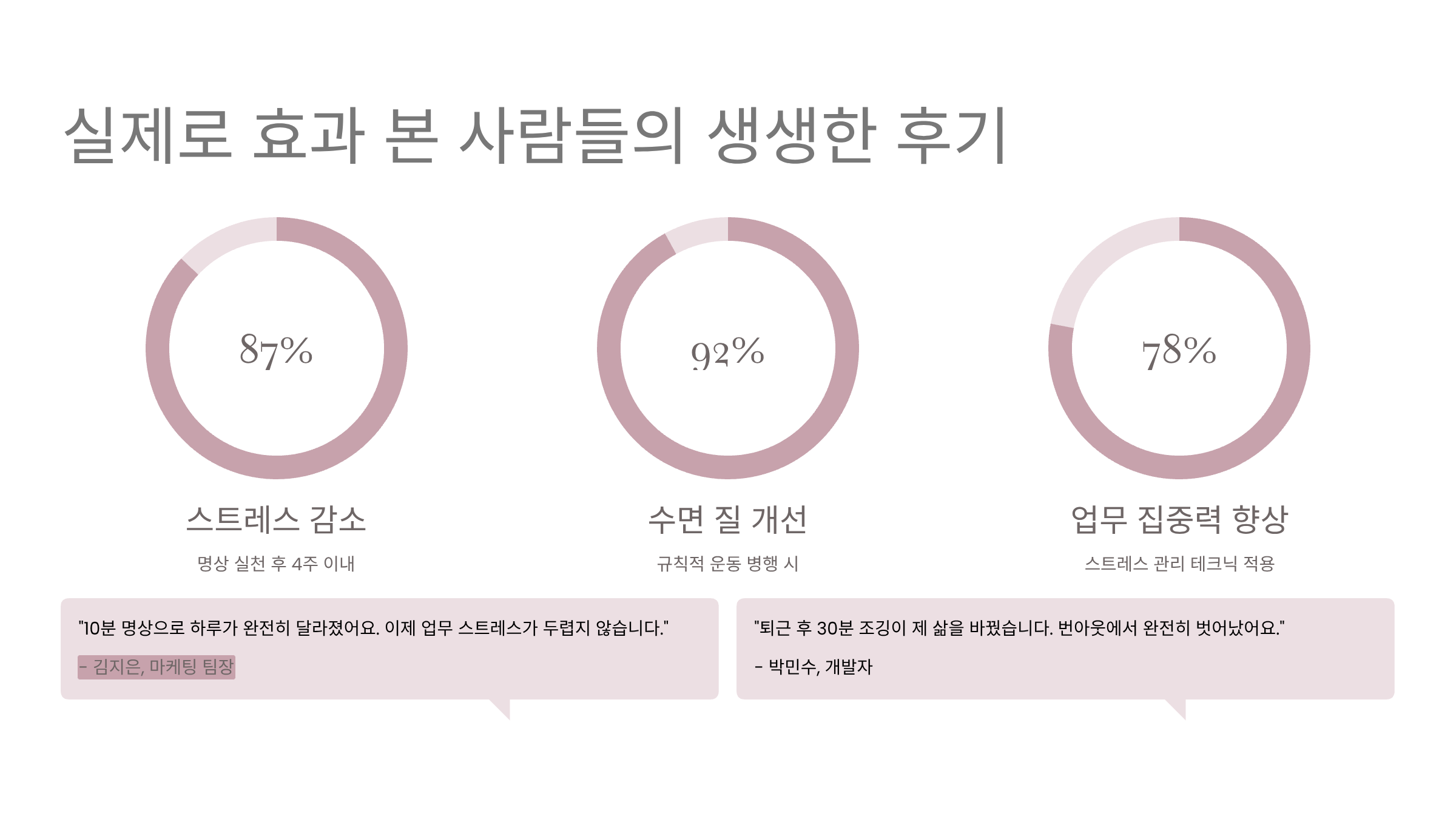 | 김지현(32세) | 4-7-8 호흡법 | 1개월 | 아침 답답함 해소 |