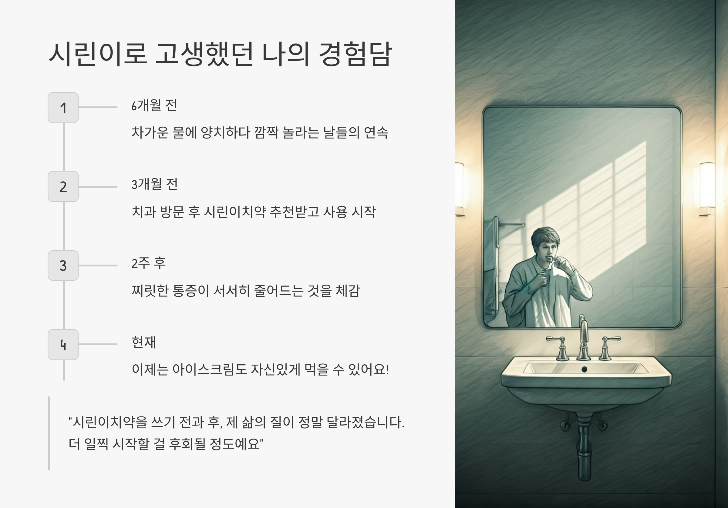 30대 직장인 김 모 씨는 스케일링 후 심해진 시린 이로 고생하다가 시린 이치약을 사용하기 시작했어요. 처음 일주일은 큰 변화를 느끼지 못했지만 2주 차부터 찬물을 마실 때 덜 시리다는 것을 체감했다고 해요. 한 달 후에는 아이스 아메리카노도 부담 없이 마실 수 있게 되었다고 기쁨을 전했어요.
