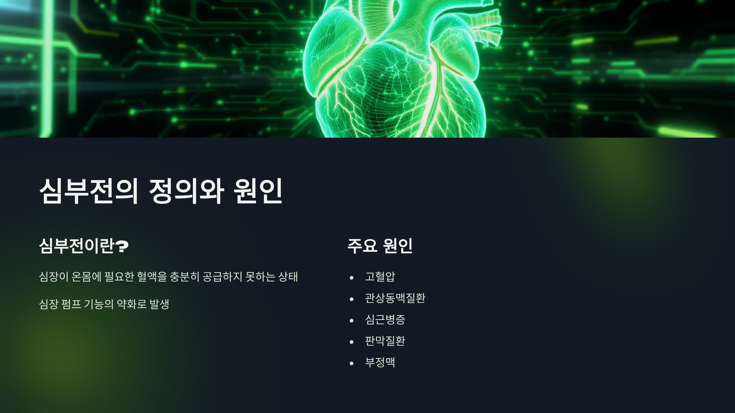 심부전은 심장의 펌프 기능이 저하되어 전신에 충분한 혈액을 공급하지 못하는 상태예요. 심장은 우리 몸의 엔진과 같은 역할을 하는데, 이 엔진이 제대로 작동하지 않으면 온몸에 영향을 미치게 되죠. 심부전은 갑자기 발생하는 급성 심부전과 서서히 진행되는 만성 심부전으로 구분할 수 있어요. 대부분의 경우 만성 심부전이 더 흔하며, 적절한 관리를 통해 진행을 늦출 수 있답니다.