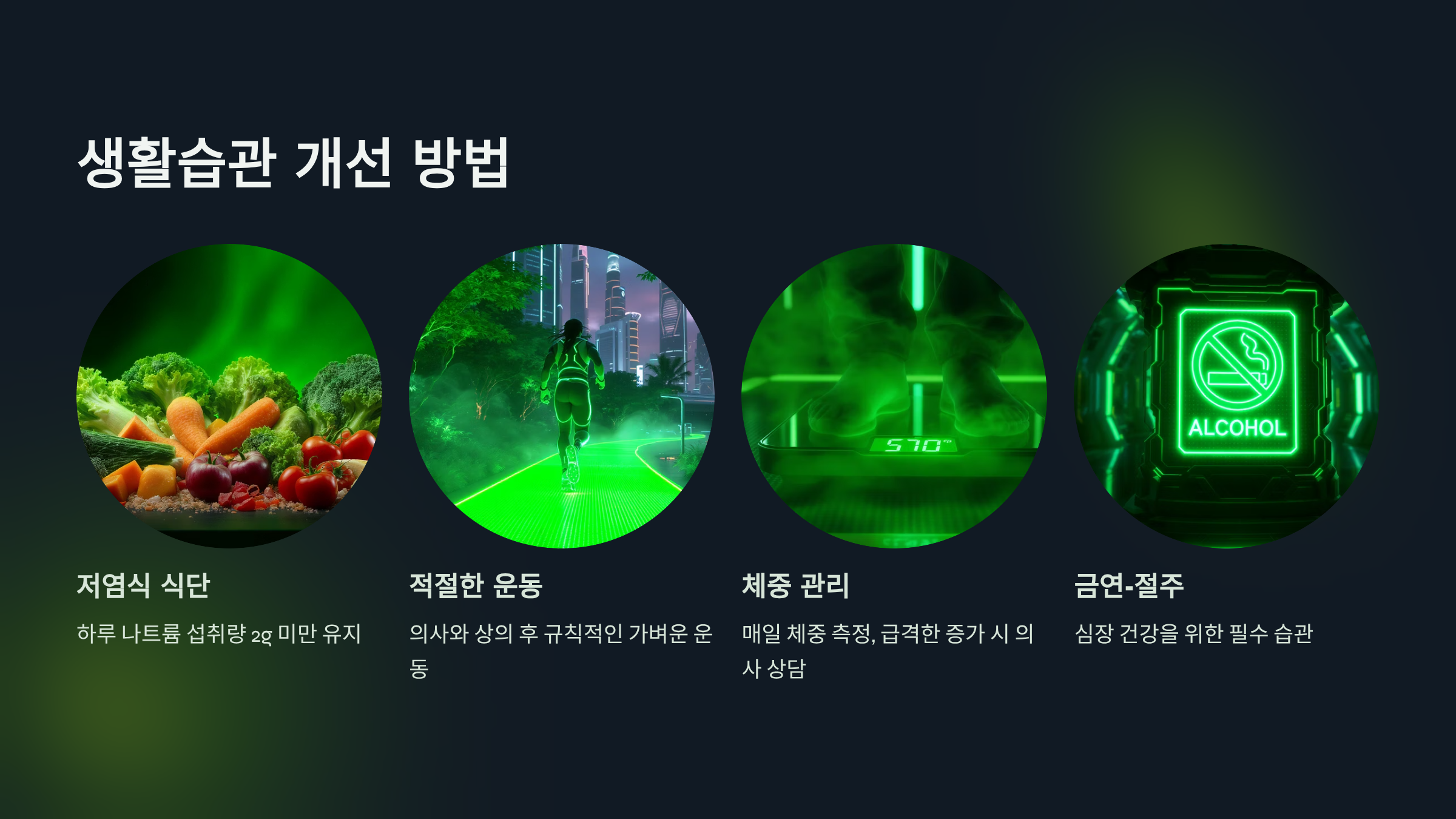 A30. 꾸준한 약물 복용, 규칙적인 운동, 저염식, 금연금주, 체중 관리, 스트레스 관리가 핵심이에요. 정기 검진을 받고, 증상 변화를 주의 깊게 관찰하며, 긍정적인 마음가짐을 유지하는 것이 중요해요.