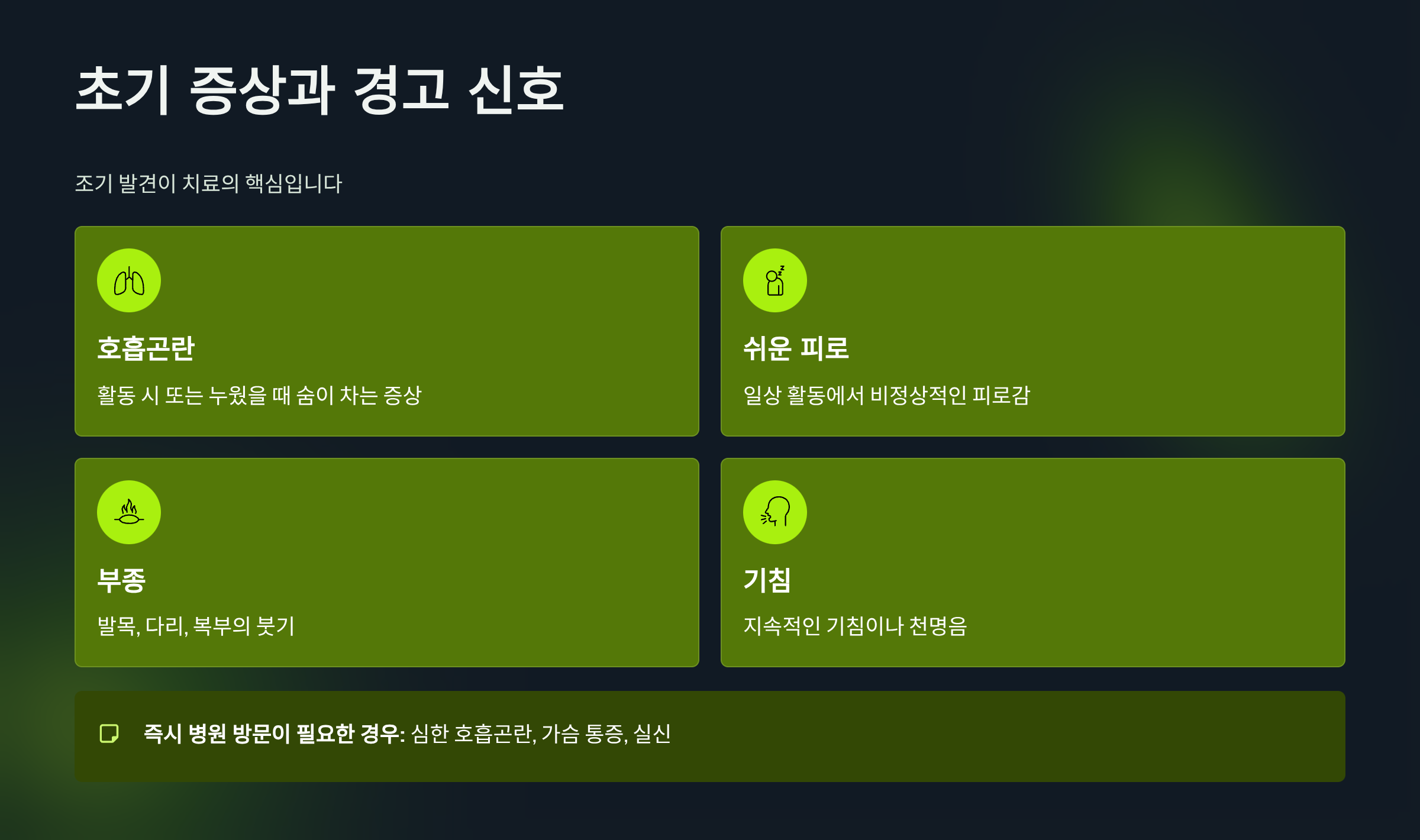 심부전의 가장 흔한 초기 증상은 호흡곤란이에요. 처음에는 계단을 오르거나 빨리 걸을 때만 숨이 차다가, 점점 가벼운 활동에도 숨이 차게 되죠. 밤에 누워있다가 갑자기 숨이 막혀 깨는 발작성 야간 호흡곤란도 특징적인 증상이에요. 베개를 높이 베고 자거나 앉아서 자는 것이 편하다면 심부전을 의심해봐야 해요. 기침이 지속되고 거품 섞인 가래가 나오기도 한답니다.