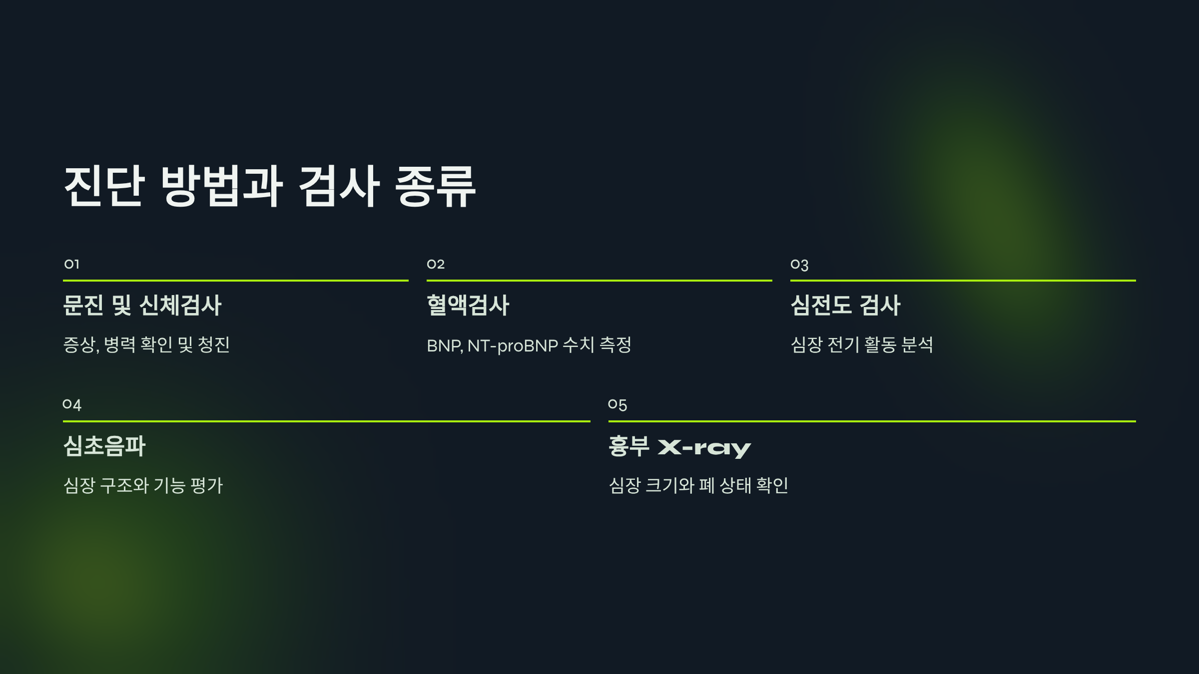 흉부 X선 검사는 심장 크기와 폐울혈 여부를 확인할 수 있어요. 심장이 커져 있거나 폐에 체액이 차 있으면 X선 사진에서 확인할 수 있죠. 심장초음파는 심부전 진단의 핵심 검사예요. 심장의 구조와 기능을 실시간으로 볼 수 있고, 좌심실 박출률을 정확히 측정할 수 있어요. 판막 질환, 심장벽 운동 이상, 심낭 삼출 등도 확인 가능하답니다.