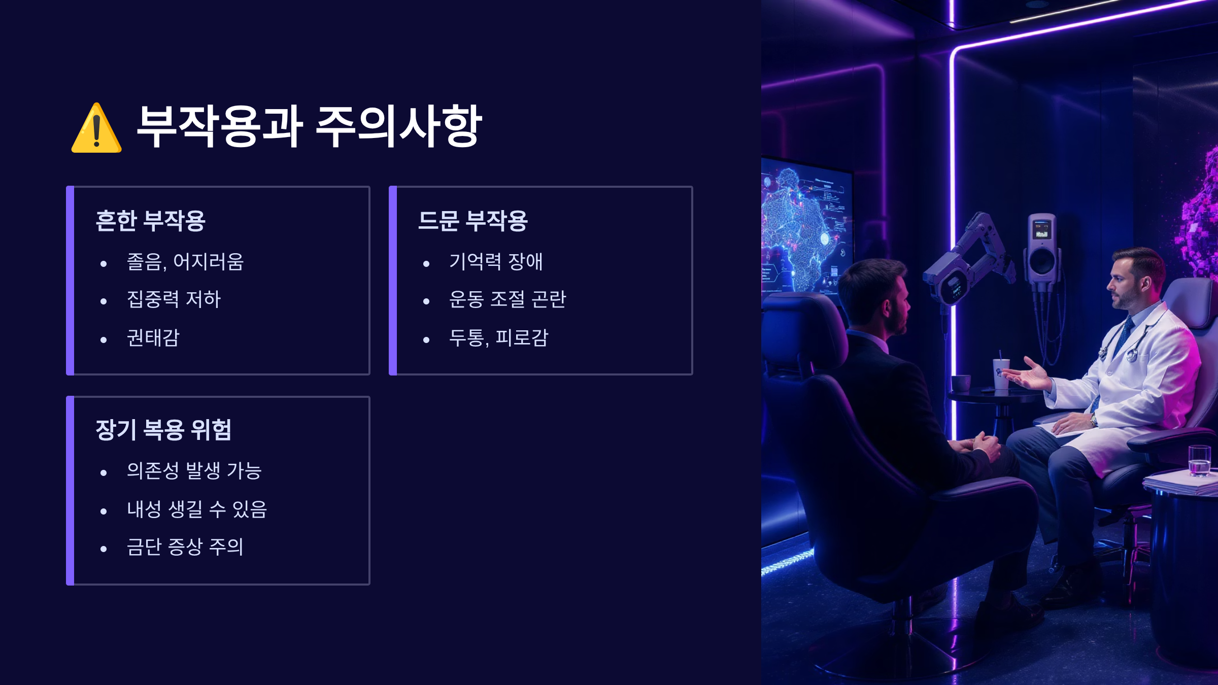 금단 증상은 갑작스러운 중단 시 나타나는 위험한 부작용이에요. 불안, 불면, 발한, 진전, 근육통, 두통 등이 나타날 수 있으며, 심한 경우 경련이나 정신병적 증상까지 발생할 수 있답니다. 이러한 금단 증상은 복용 중단 후 1-4일 내에 나타나며, 1-2주간 지속될 수 있어요.