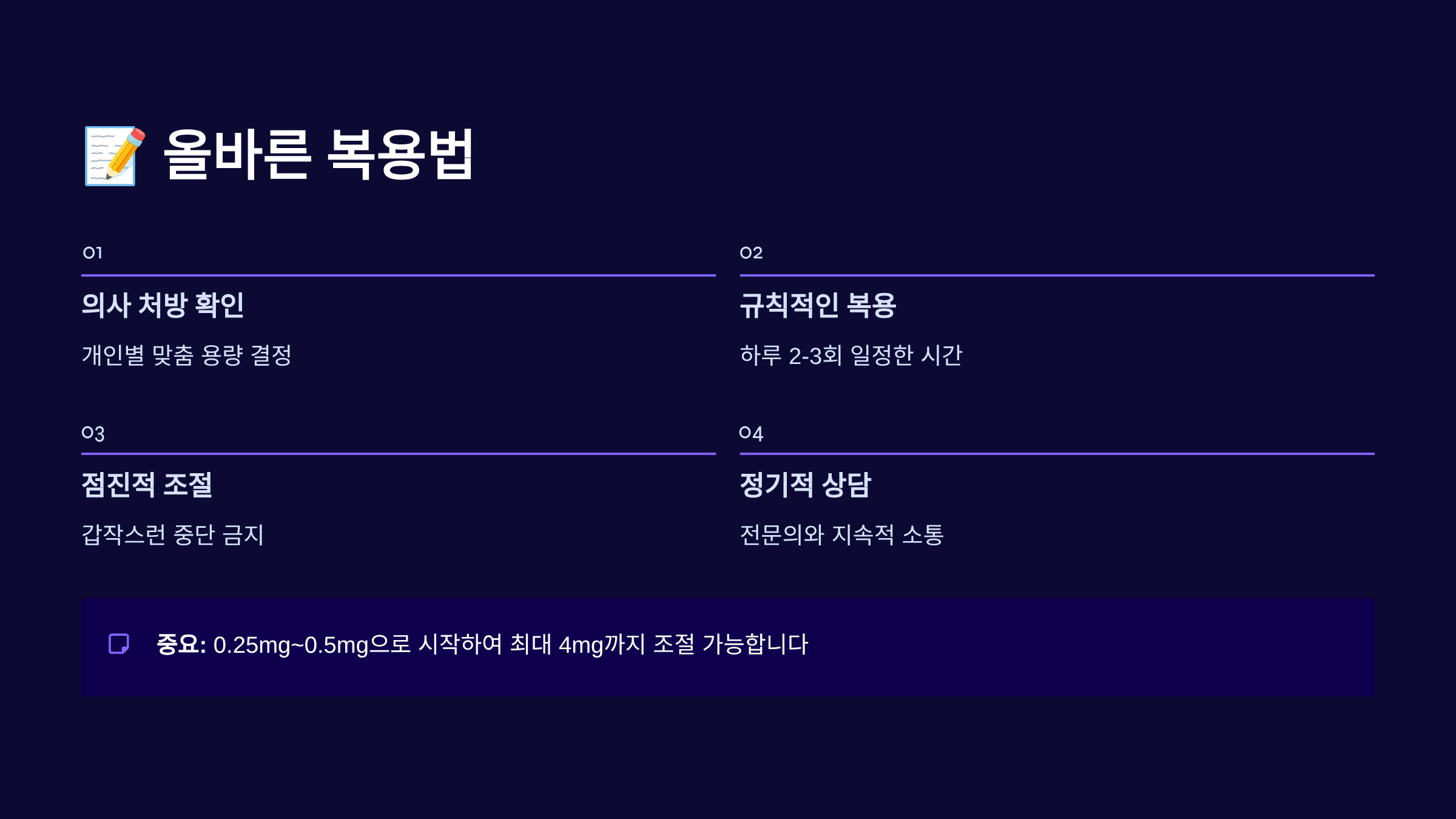 A1. 성인 기준 하루 0.25-0.5mg을 2-3회 분할 복용으로 시작하는 것이 일반적이에요. 개인의 증상과 반응에 따라 의사가 조절하므로 처방된 용량을 정확히 따르세요.