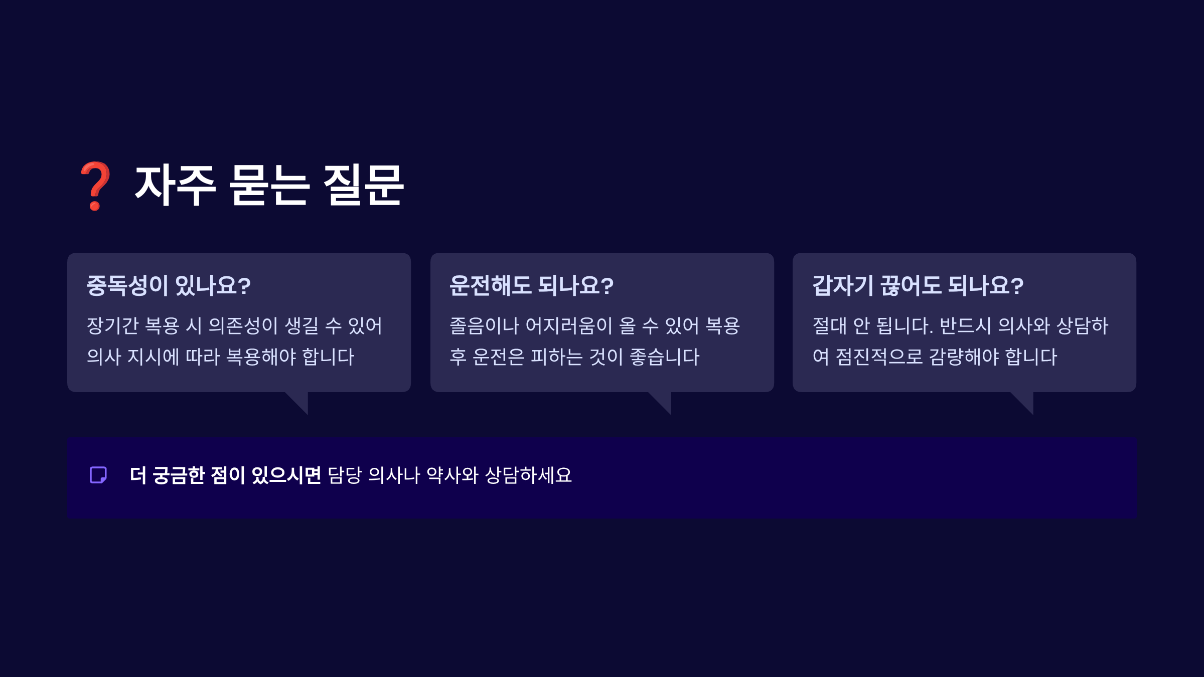 A5. 금단 증상이 발생할 수 있어요. 불안, 불면, 발한, 진전, 심한 경우 경련까지 나타날 수 있으므로 반드시 의사 지도 하에 점진적으로 감량해야 합니다.