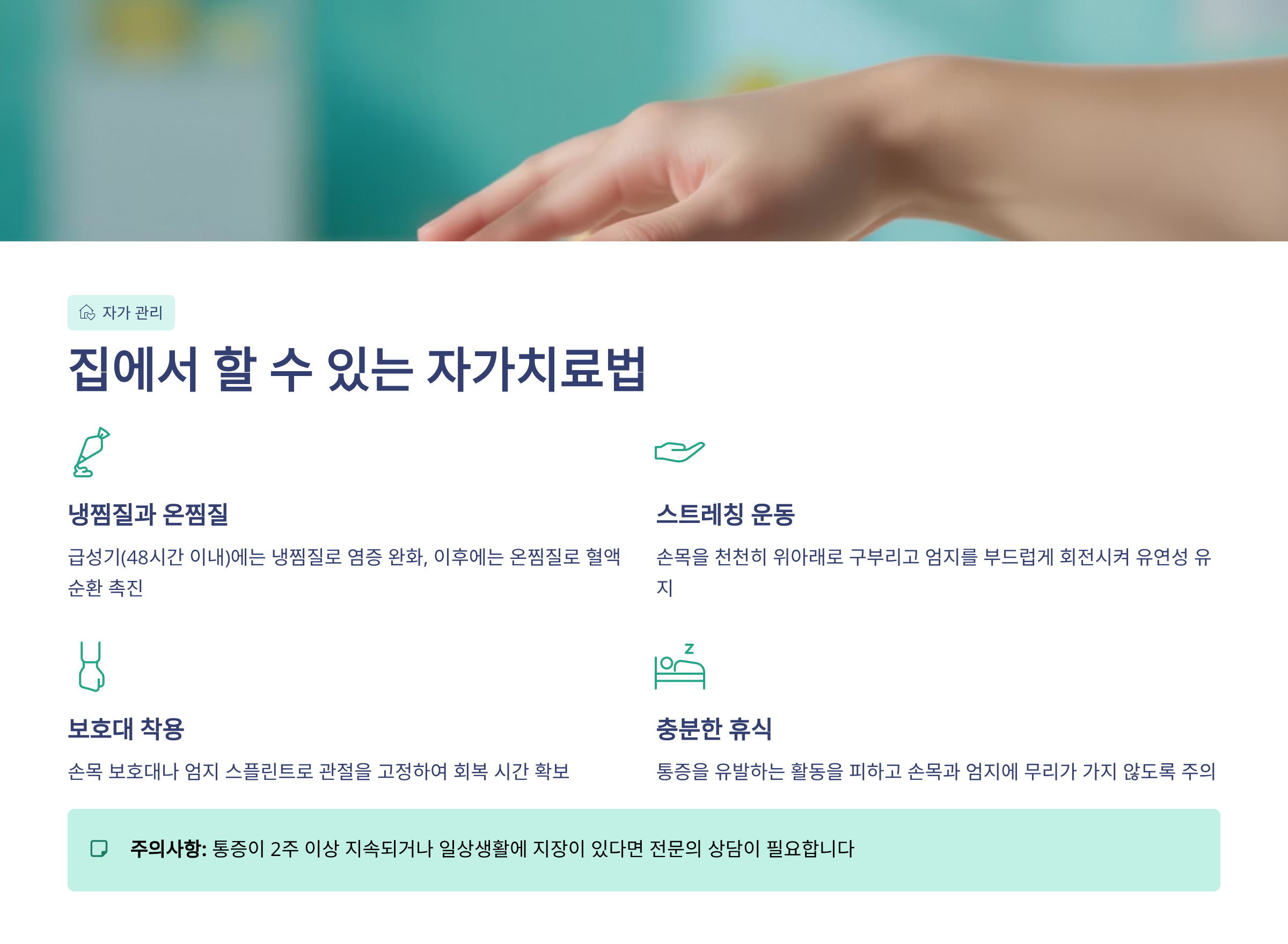 A1. 통증이 2주 이상 지속되거나, 휴식을 취해도 호전되지 않거나, 부종이나 발적이 동반되거나, 손가락 움직임에 제한이 있다면 전문의 진료를 받는 것이 좋아요.