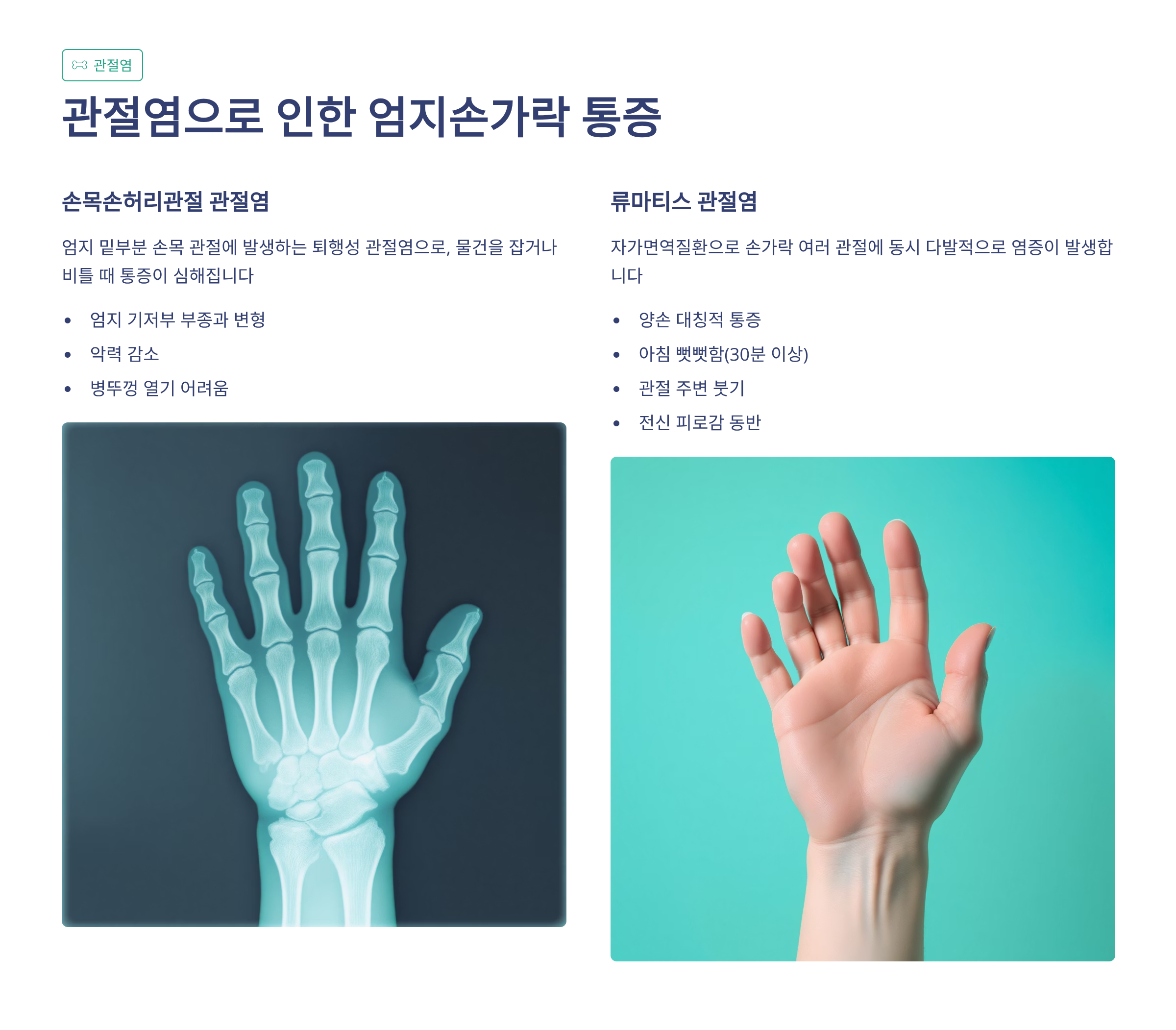 퇴행성 관절염은 관절을 구성하는 연골이 마모되면서 발생하는 질환이에요. 나이가 들면서 연골이 닳아지고, 뼈와 뼈가 직접 마찰하면서 통증과 염증이 생겨요. 엄지손가락의 경우 특히 기저부 관절, 즉 엄지손가락과 손목이 만나는 부위에서 퇴행성 관절염이 흔하게 발생해요. 이 관절은 일상생활에서 매우 빈번하게 사용되기 때문에 마모가 빨리 진행될 수 있어요.