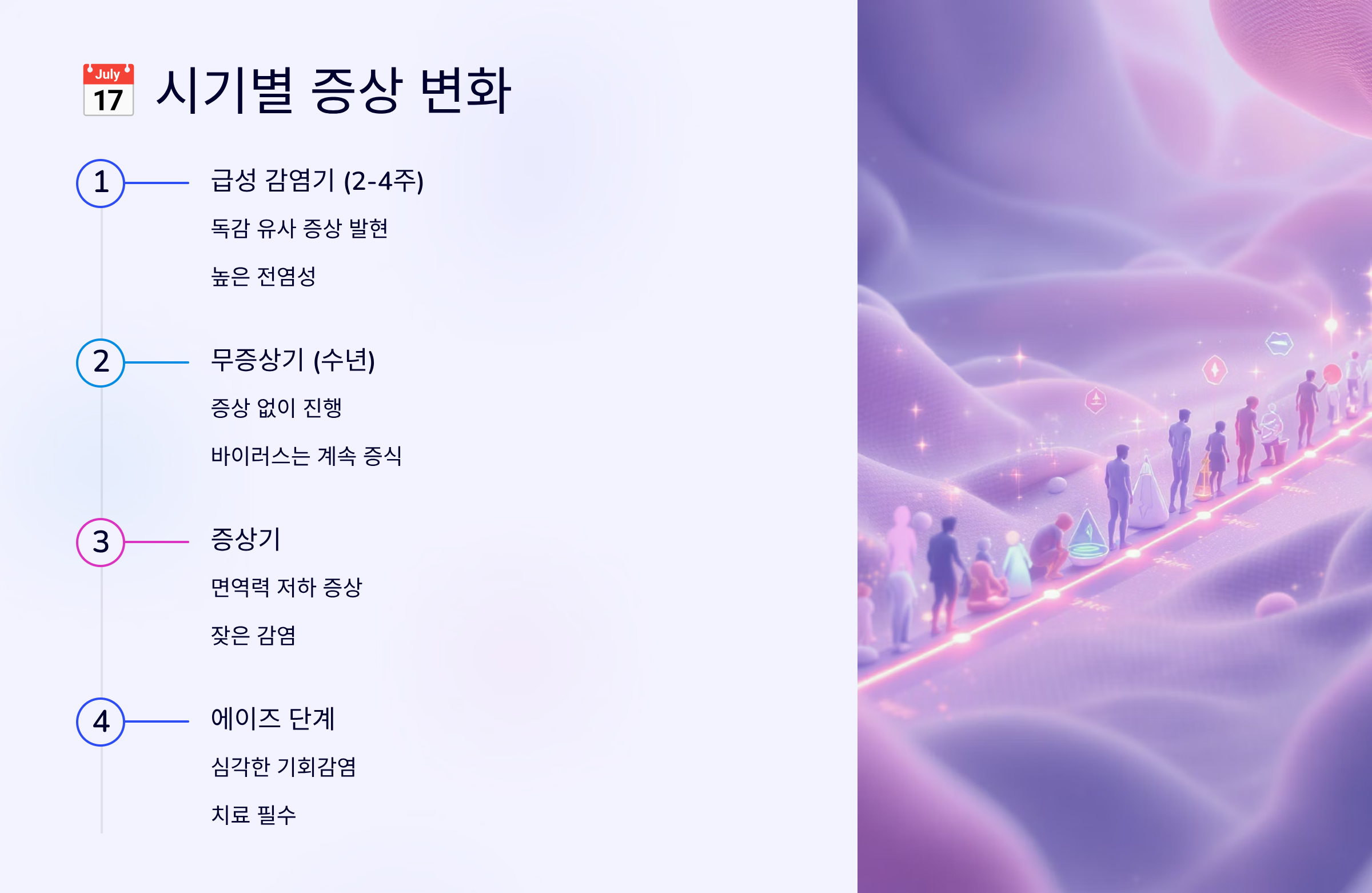 | 에이즈기 | 치료 없이 2-3년 | 심각한 면역저하 |