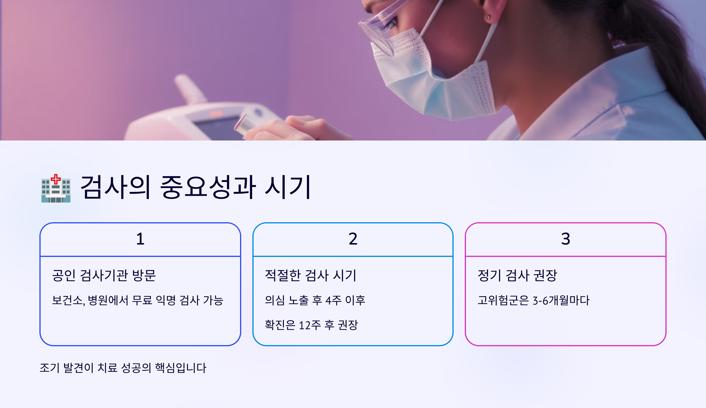 초기 증상이 나타났을 때 빠르게 검사를 받는 것이 중요해요. 조기 진단을 받으면 적절한 시기에 치료를 시작할 수 있고, 다른 사람에게 전파시킬 위험도 줄일 수 있답니다. HIV 검사는 전국 보건소에서 무료로 익명 검사가 가능해요. 🏥