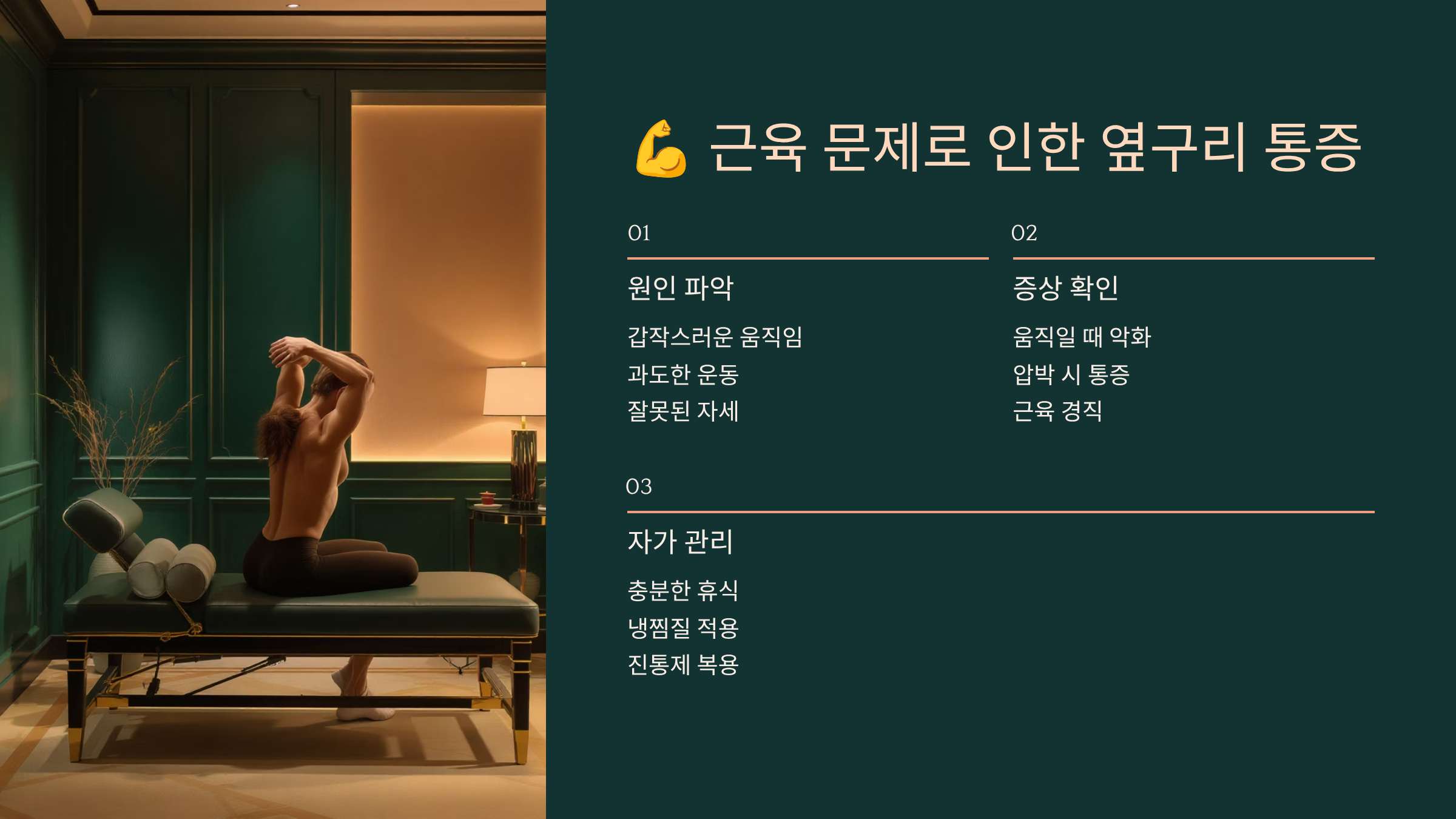옆구리 근육통은 일상생활에서 가장 흔하게 경험하는 통증 중 하나예요. 복사근, 광배근, 요방형근 등 옆구리 주변의 여러 근육들이 과도하게 사용되거나 손상을 받으면 통증이 발생하죠. 특히 갑작스러운 운동이나 무거운 물건을 들 때, 잘못된 자세로 장시간 앉아있을 때 근육에 무리가 가면서 통증이 생기게 돼요. 이런 근육통은 움직일 때 더 심해지고, 휴식을 취하면 완화되는 특징이 있답니다.