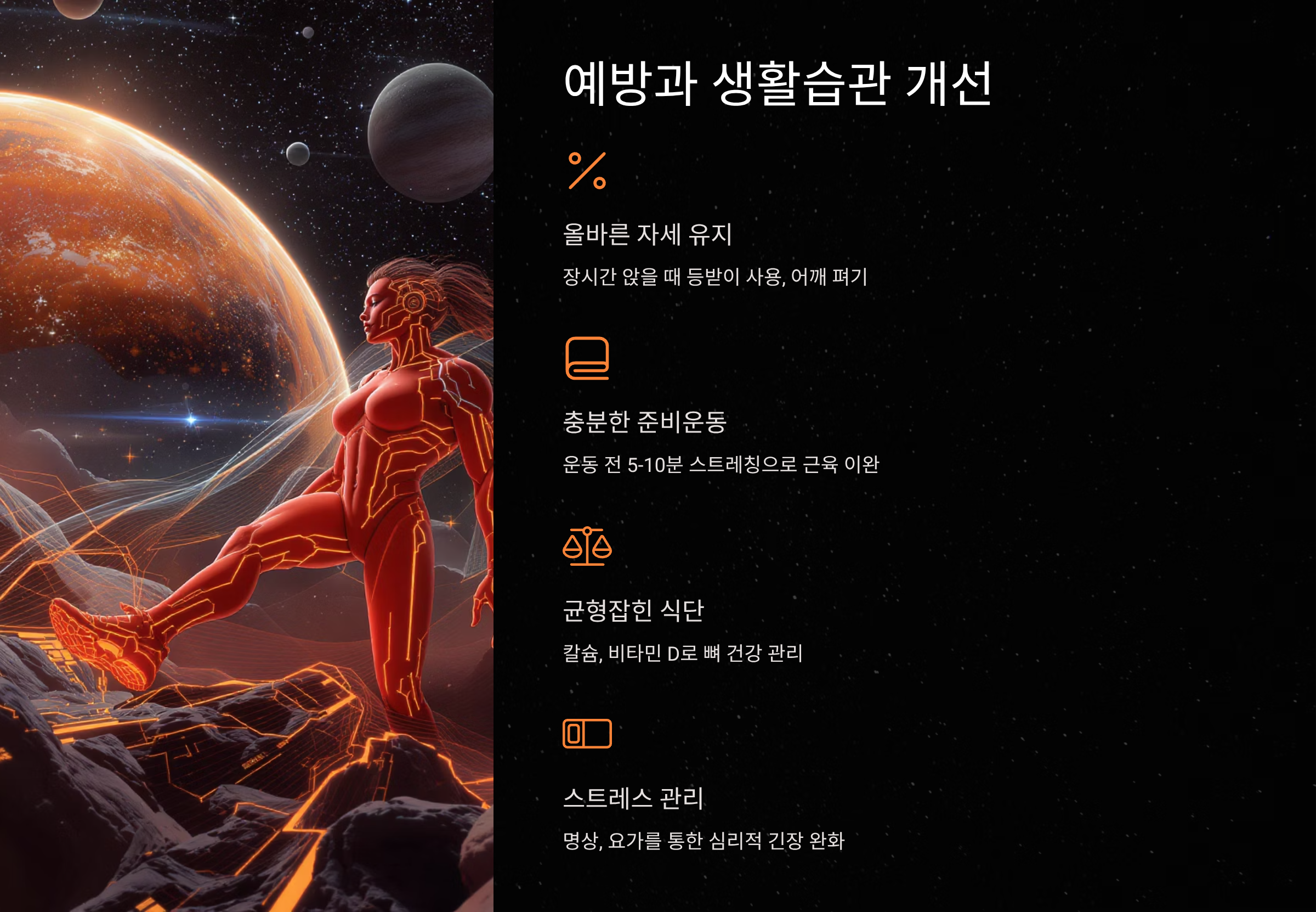 스트레스 관리는 통증 예방에 필수적이에요. 명상, 요가, 심호흡 등의 이완 기법을 일상에 포함시켜요. 취미 활동이나 사회적 교류로 긍정적인 감정을 유지해요. 충분한 수면은 스트레스 호르몬을 조절하고 면역력을 높여요. 하루 7-8시간의 규칙적인 수면 패턴을 유지하고, 수면 환경을 개선해요.