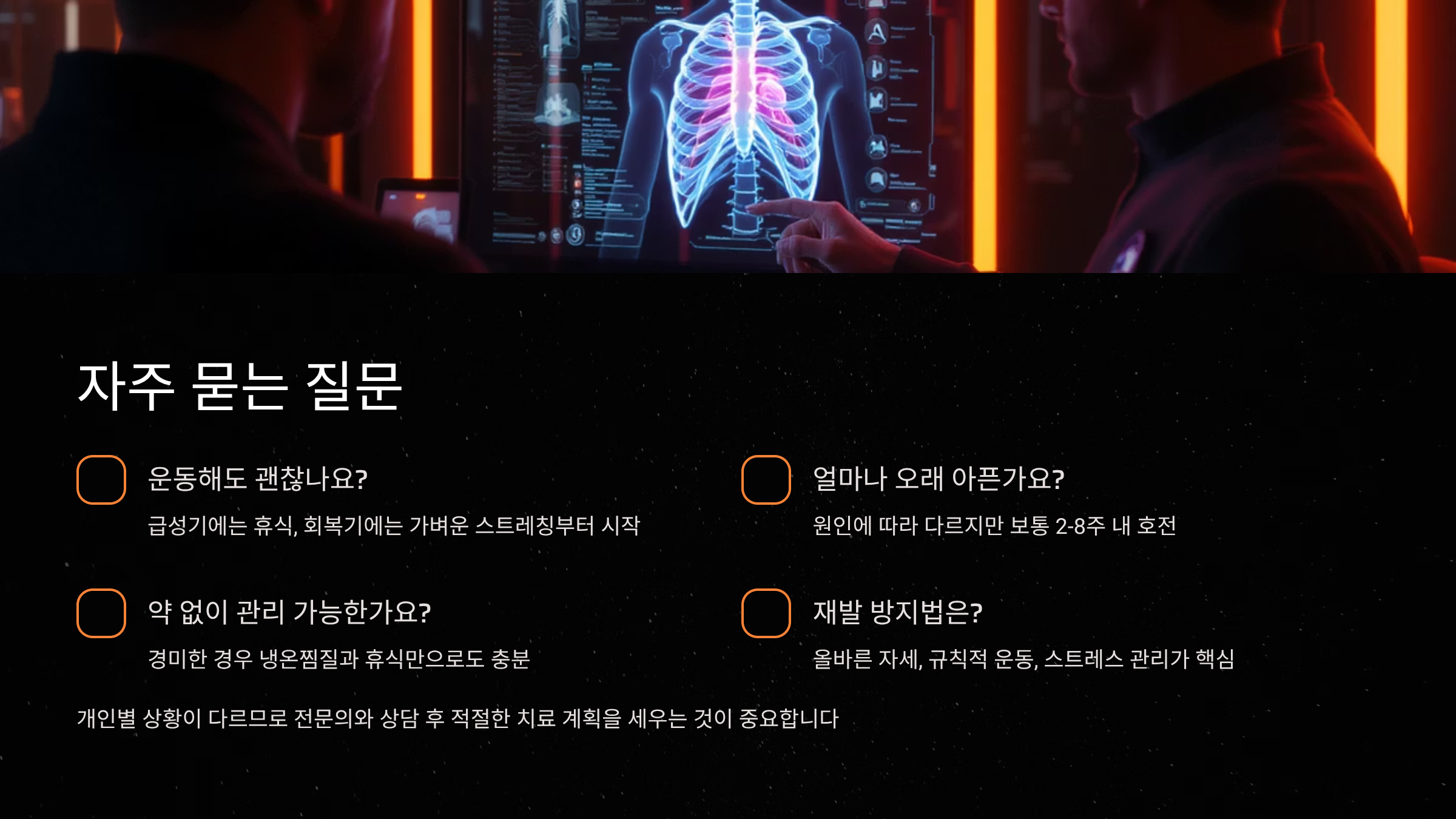 A3. 네, 스트레스는 근육 긴장을 유발해 늑간근육통을 일으킬 수 있어요. 또한 스트레스로 인한 과호흡은 가슴 통증을 유발하고, 위산 분비를 증가시켜 역류성 식도염을 악화시켜요. 스트레스 관리를 통해 통증이 호전되는 경우가 많으므로, 명상, 요가, 규칙적인 운동 등으로 스트레스를 관리하는 것이 중요해요.