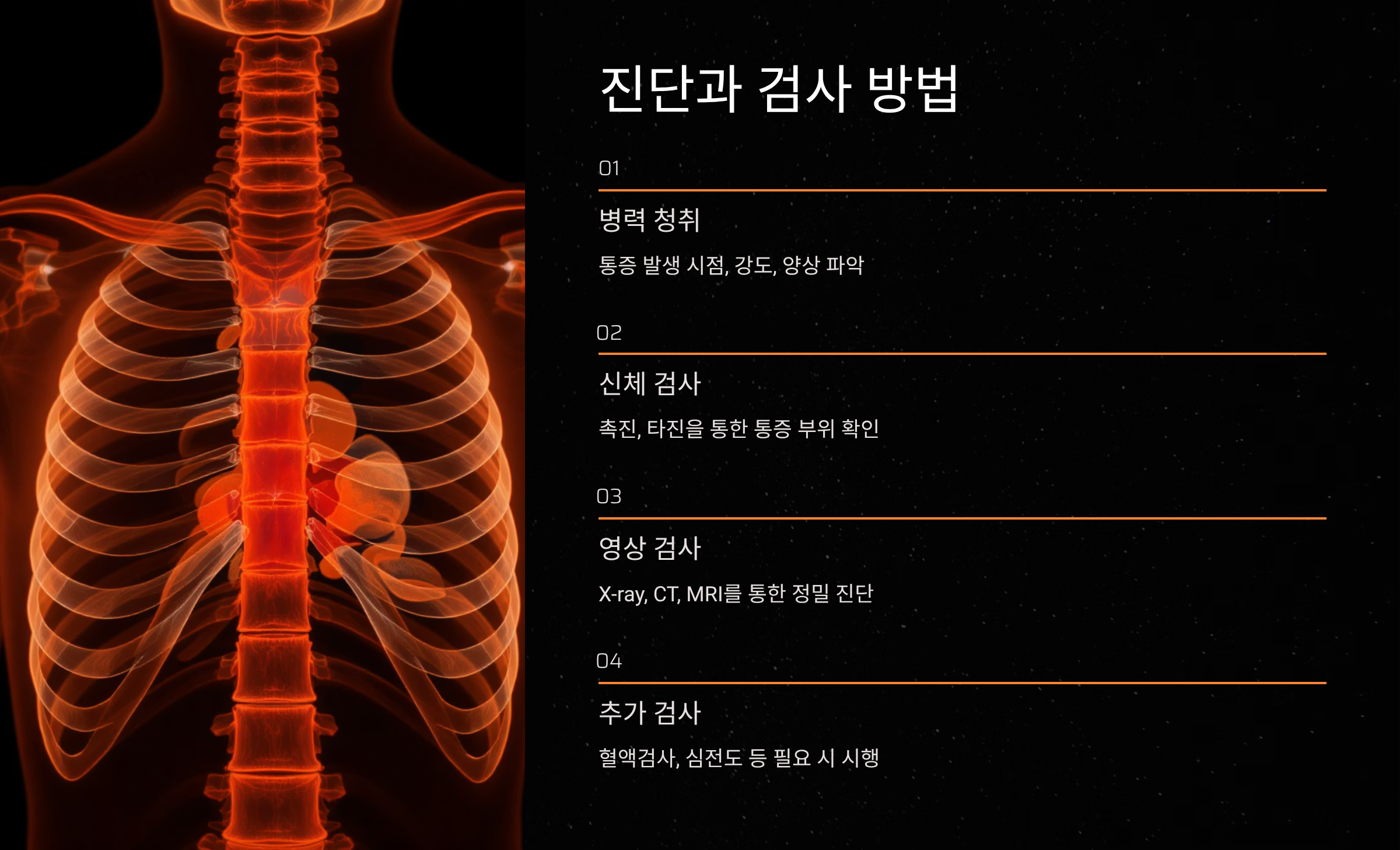 정확한 진단을 위해서는 체계적인 검사가 필요해요. 먼저 의사는 자세한 병력 청취와 신체 검진을 시행해요. 통증의 위치, 양상, 지속 시간, 악화 요인, 동반 증상 등을 꼼꼼히 확인해요. 촉진을 통해 압통 부위를 확인하고, 청진으로 심장과 폐의 이상 유무를 확인해요. 이 과정에서 대부분의 근골격계 문제는 진단이 가능해요.
