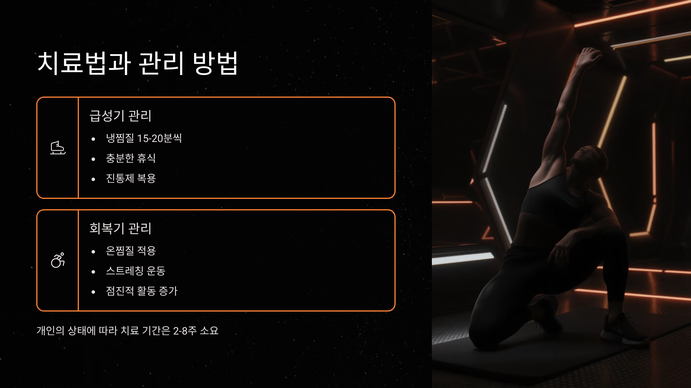 치료는 원인에 따라 달라지지만, 통증 관리가 우선이에요. 급성기에는 충분한 휴식과 함께 진통소염제를 복용해요. 아세트아미노펜이나 이부프로펜 같은 일반의약품으로 시작하되, 용법용량을 지키는 것이 중요해요. 위장 장애가 있다면 위장 보호제를 함께 복용하는 것이 좋아요. 국소 진통제나 파스도 도움이 될 수 있어요.