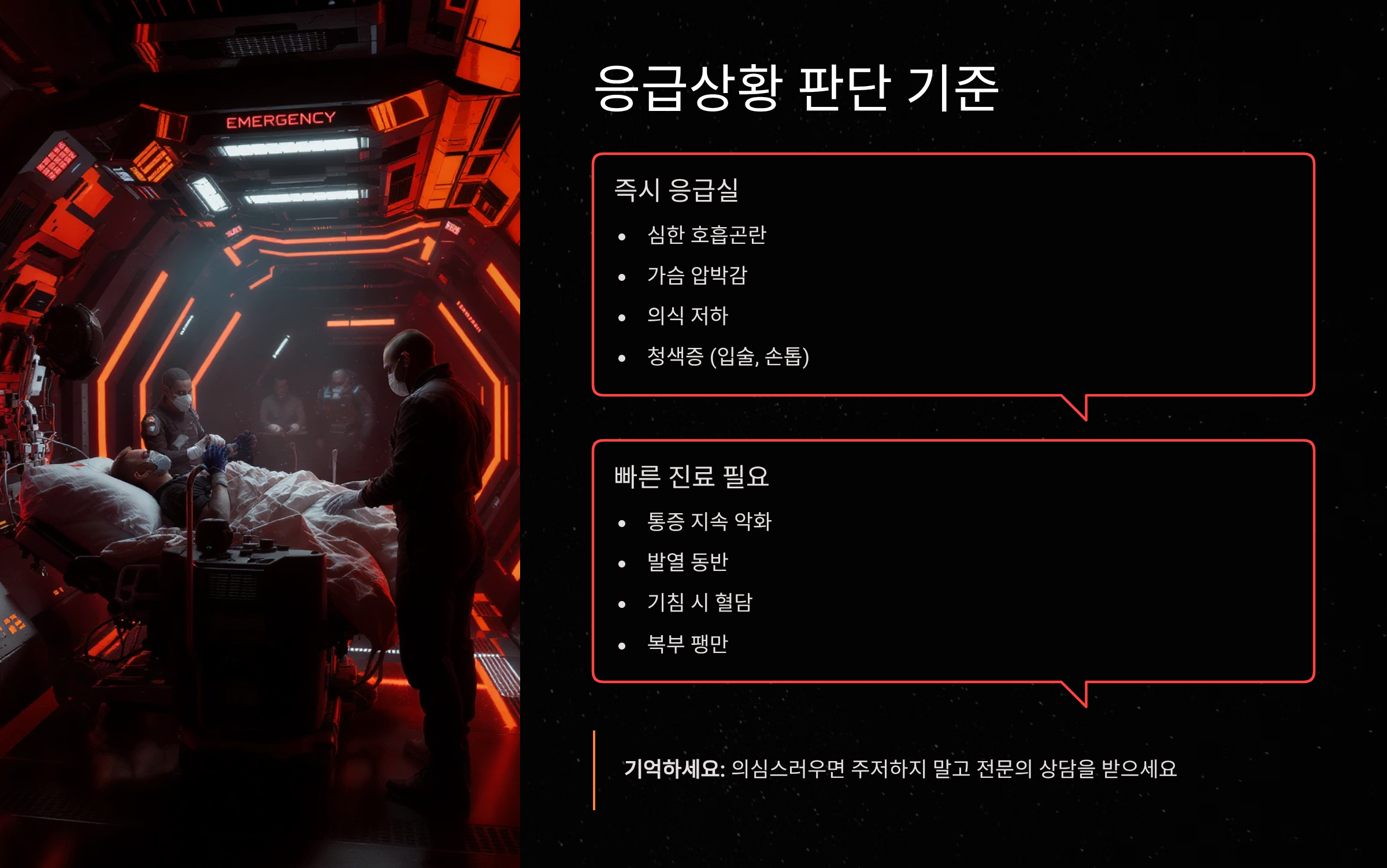 나의 생각으로는 응급 상황 판단 시 과도한 걱정보다는 침착한 대응이 중요해요. 증상을 정확히 파악하고, 필요시 주변에 도움을 요청하며, 의료진에게 명확히 설명할 수 있도록 준비해요. 평소 응급 연락처를 저장해 두고, 복용 중인 약물 목록을 준비해 두면 응급 상황에서 도움이 돼요. 건강은 예방이 최선이지만, 응급 상황에 대한 대비도 중요하답니다! 😊