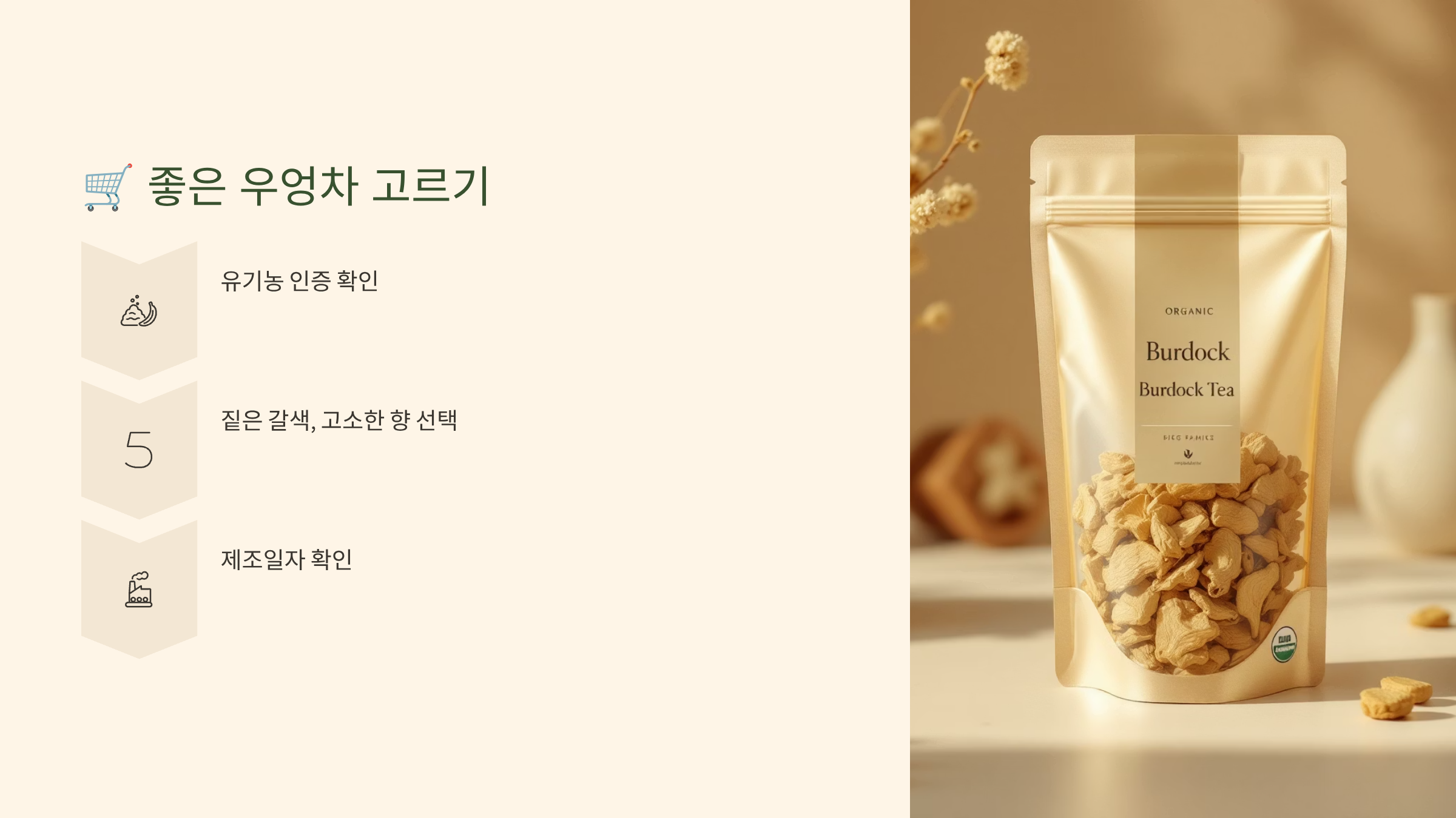 시중에 판매되는 우엉차 제품을 고를 때는 원재료를 먼저 확인해야 해요. 100% 우엉만 사용한 제품이 가장 좋고, 첨가물이나 방부제가 들어있지 않은 것을 선택하세요. 유기농 인증 마크가 있는 제품이라면 더욱 안심하고 마실 수 있답니다. 국내산 우엉을 사용한 제품이 신선도와 품질 면에서 우수한 경우가 많아요.