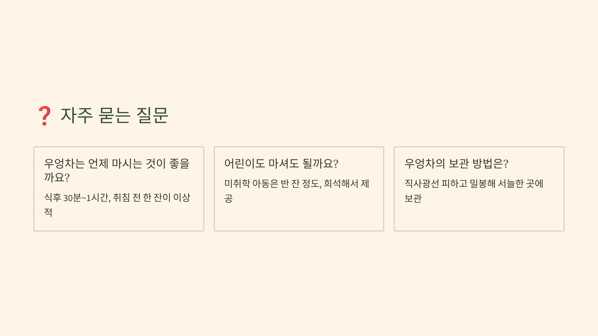 A8. 직사광선을 피하고 서늘하고 건조한 곳에 밀폐 보관하세요. 개봉 후에는 3-6개월 내에 소비하는 것이 좋고, 우려낸 차는 냉장 보관 시 2-3일 내에 마시는 것이 좋답니다.
