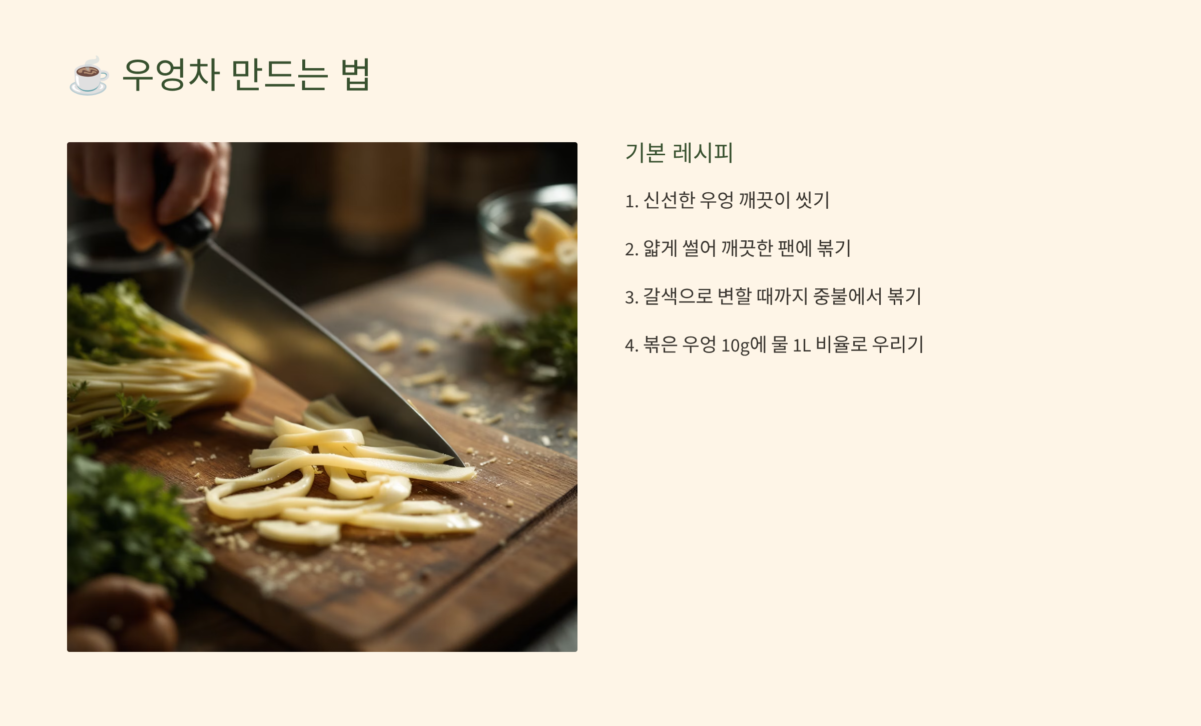 우엉차 만드는 방법은 크게 두 가지예요. 첫 번째는 생우엉을 말려서 만드는 방법이랍니다. 우엉을 얇게 썰어 그늘에서 3-4일간 말린 후 보관하면 돼요. 두 번째는 볶아서 만드는 방법인데, 이게 더 구수하고 맛있답니다. 우엉을 어슷 썰기로 자른 후 팬에 기름 없이 약한 불에서 15-20분간 볶아주세요. 갈색빛이 돌고 구수한 향이 나면 완성이에요.