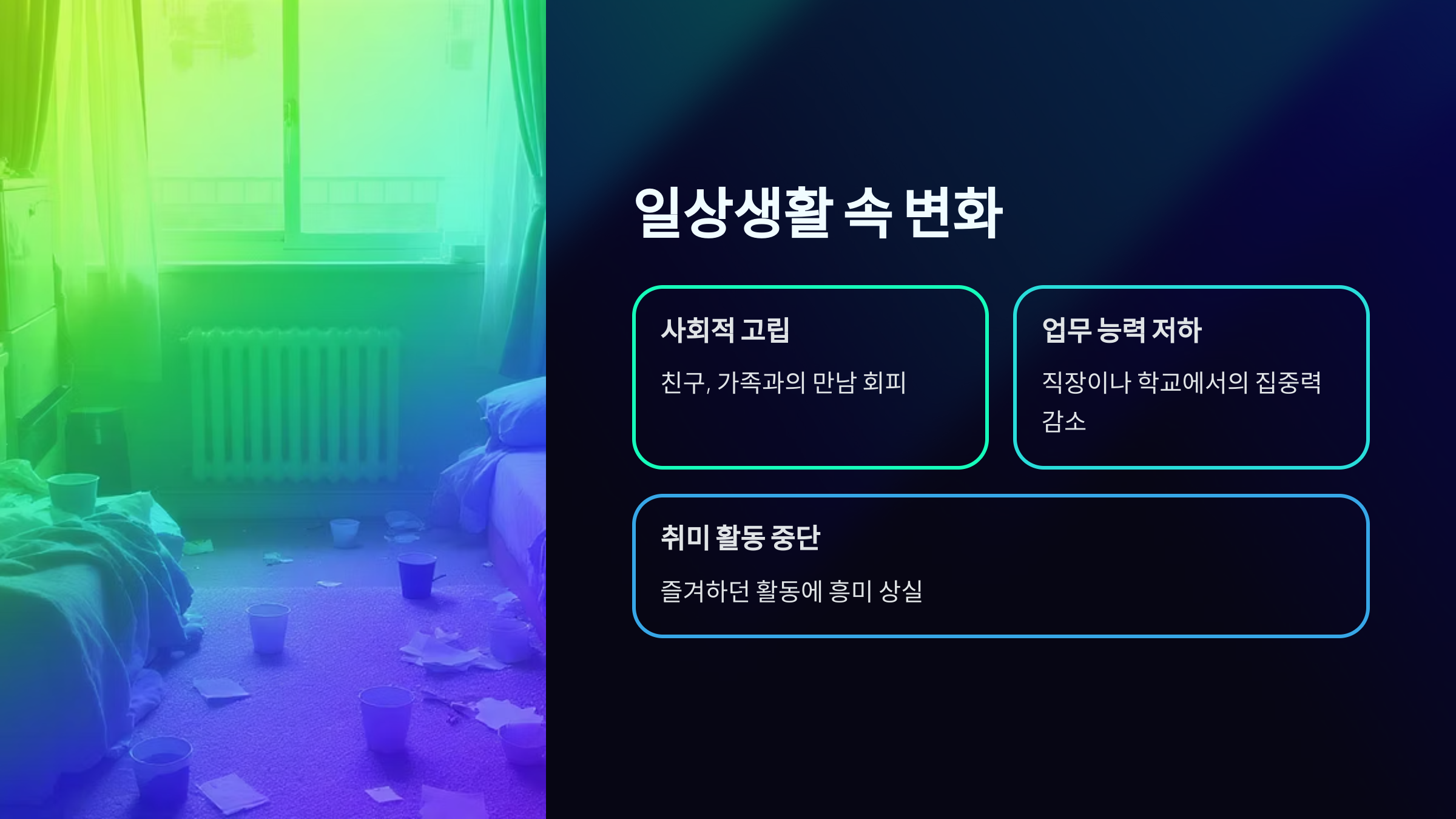 사회적 활동이 현저히 줄어들어요. 친구들과의 만남을 피하고, 가족 모임에도 참석하지 않으려고 해요. 전화나 메시지에 답하는 것도 부담스러워서 연락을 끊게 돼요. SNS 활동도 줄어들고, 다른 사람들의 행복한 모습을 보는 것이 괴로워져요. 점차 사회적으로 고립되면서 외로움은 더 심해져요.