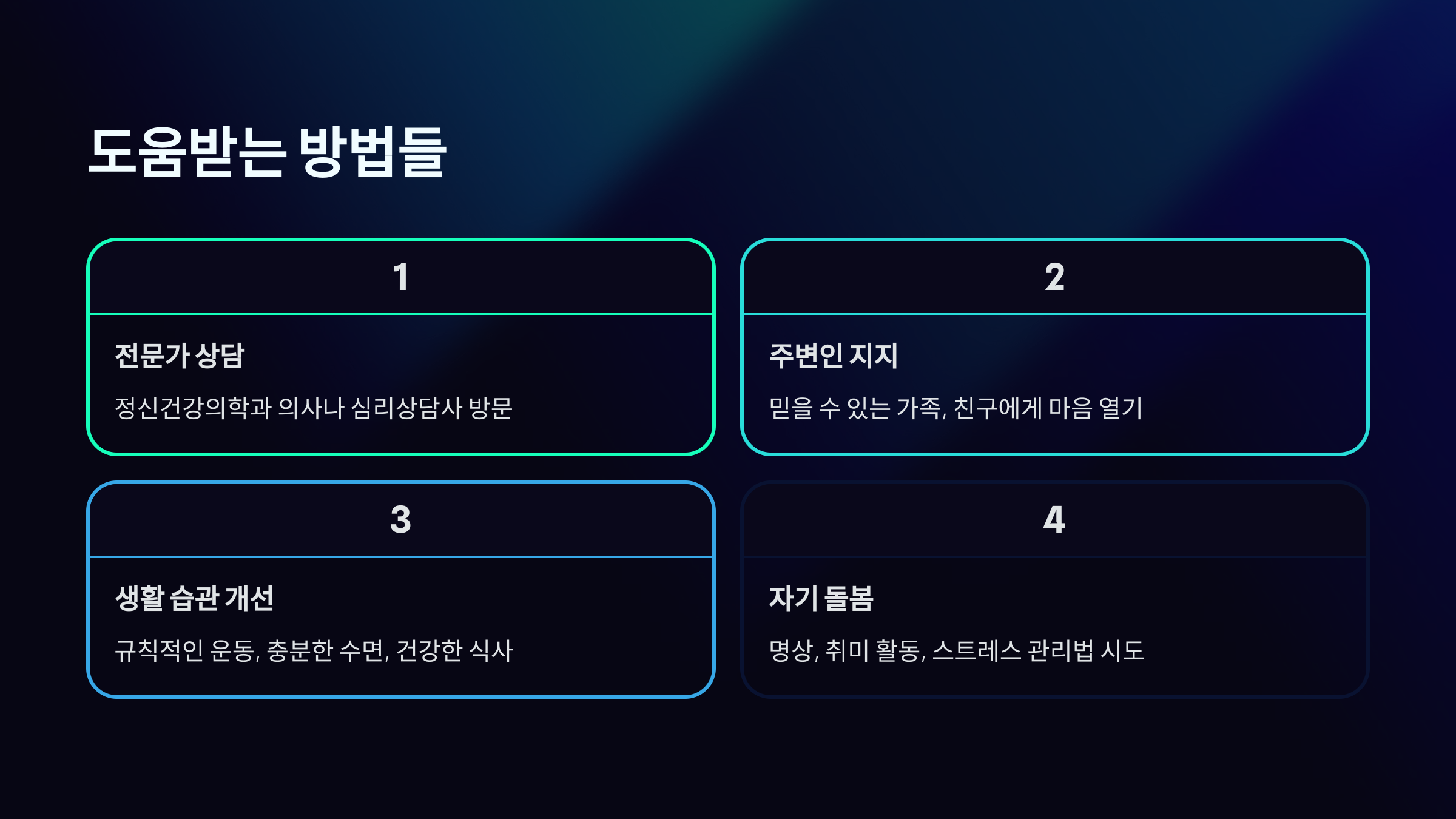 우울증은 혼자서 극복하기 어려운 질병이에요. 하지만 적절한 도움을 받으면 충분히 회복할 수 있어요. 다양한 치료 방법과 지원 체계를 활용하면 우울증에서 벗어나 건강한 삶을 되찾을 수 있답니다. 도움을 구하는 것은 약함의 표시가 아니라 용기 있는 선택이에요.