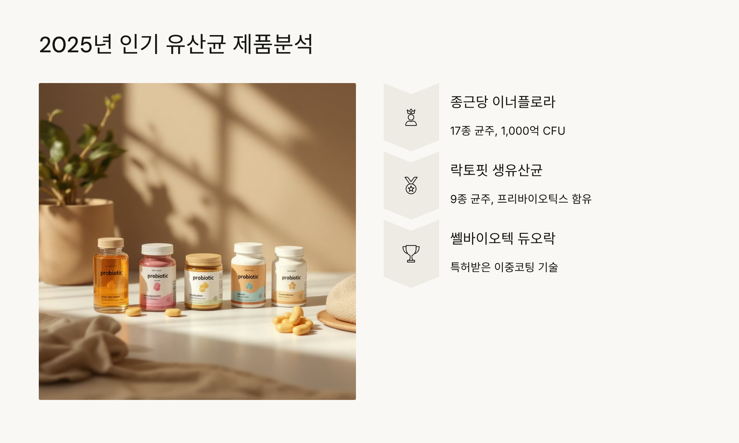 2025년 현재 시장에서 가장 인기 있는 유산균 제품들을 분석해 봤어요. 락토핏은 여전히 국내 시장 점유율 1위를 차지하고 있어요. 17가지 균주와 프리바이오틱스를 함유해 장 건강 개선에 탁월한 효과를 보여주고 있답니다. 특히 골드 제품은 보장균수가 100억 CFU로 높아서 많은 사랑을 받고 있어요.