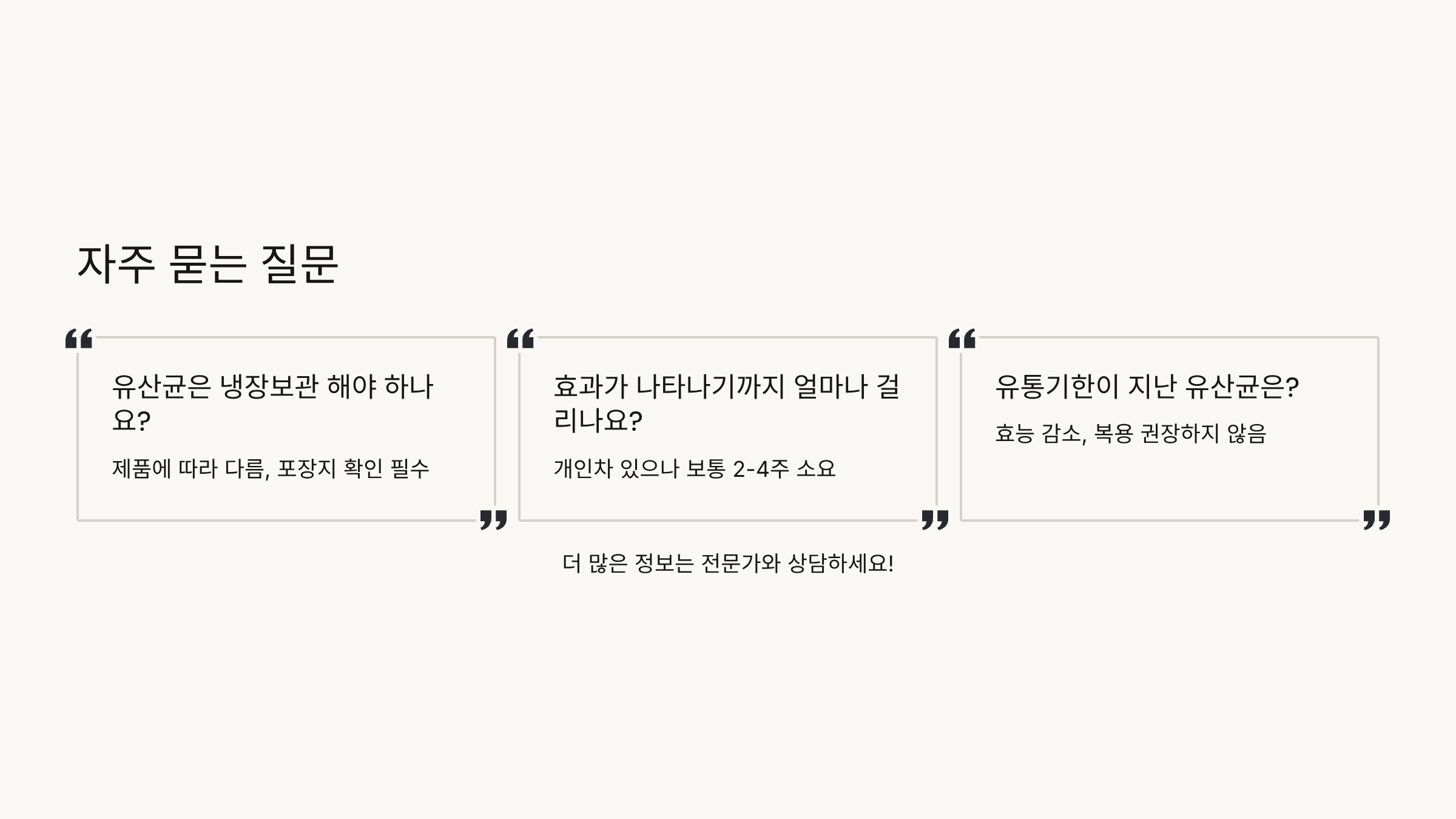 A1. 개인차가 있지만 보통 2주에서 한 달 정도면 첫 효과를 느낄 수 있어요. 변비나 설사 같은 소화기 증상은 비교적 빨리 개선되지만, 면역력 강화나 알레르기 개선은 3개월 이상 꾸준히 복용해야 효과를 볼 수 있답니다. 장내 세균총이 완전히 개선되려면 최소 3~6개월은 필요해요.