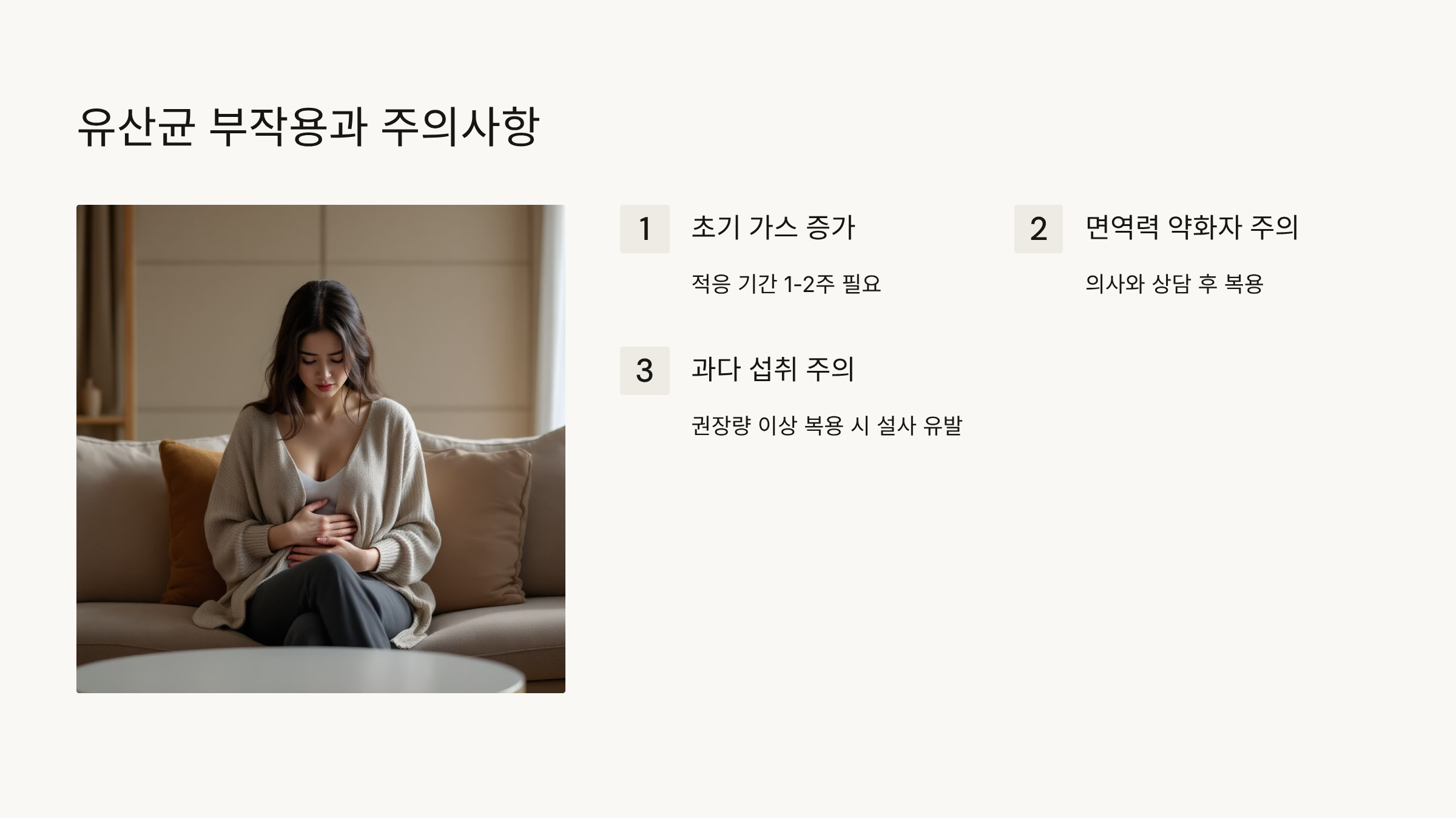 유산균은 일반적으로 안전하지만 부작용이 전혀 없는 건 아니에요. 처음 복용할 때 복부 팽만감, 가스, 설사 같은 증상이 나타날 수 있어요. 이는 장내 세균총이 변화하면서 생기는 일시적인 현상으로, 보통 1~2주 내에 사라져요. 증상이 심하다면 복용량을 줄였다가 서서히 늘려가세요.