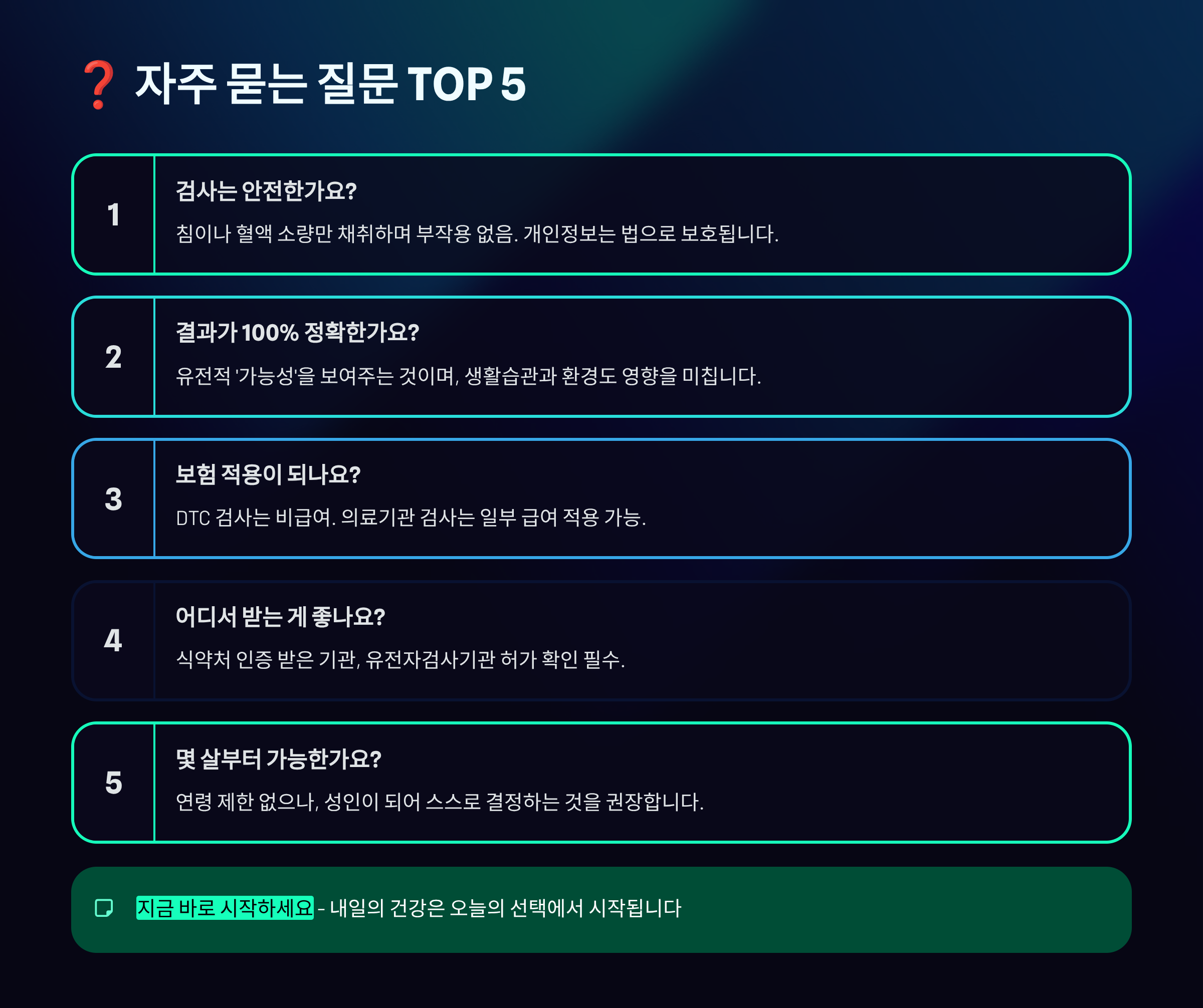 A1. 대학병원 유전자클리닉, 검진센터, 인증된 유전자검사 전문업체에서 받을 수 있어요. DTC 검사는 온라인으로도 주문 가능해요.