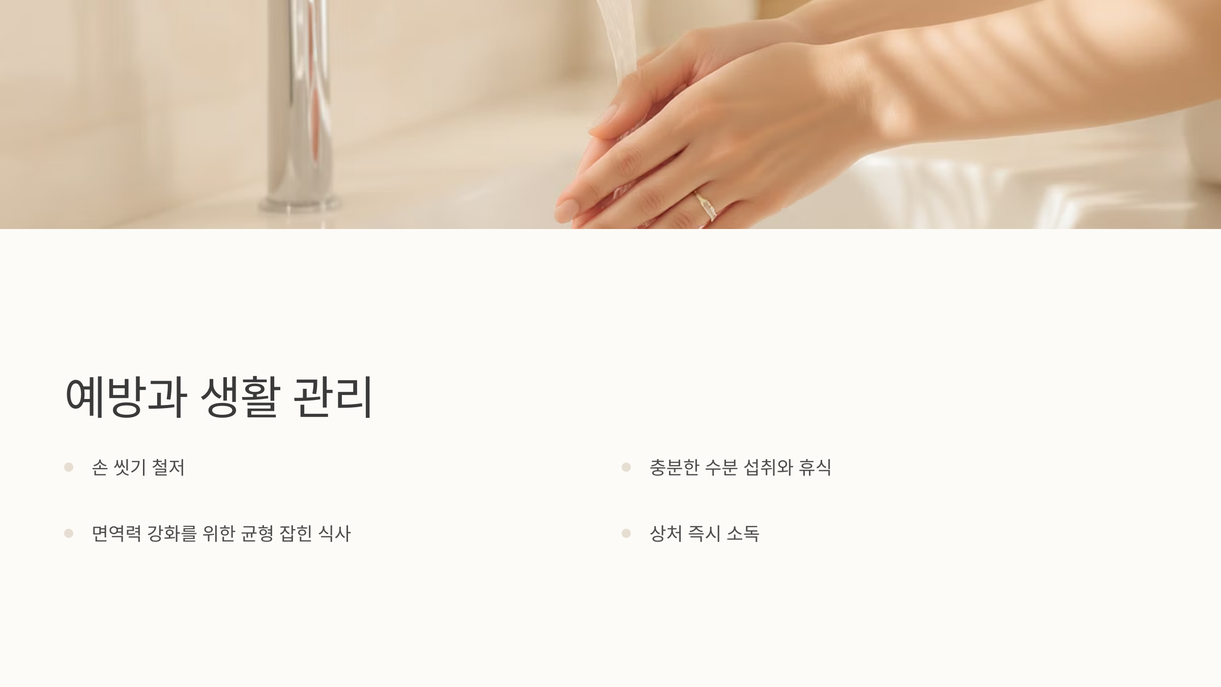 임파선염을 예방하는 가장 좋은 방법은 감염을 막는 것이에요. 손 씻기는 가장 기본적이면서도 효과적인 예방법이죠. 외출 후, 식사 전, 화장실 사용 후에는 반드시 비누로 30초 이상 손을 씻어야 해요. 특히 손가락 사이와 손톱 밑까지 꼼꼼히 씻는 것이 중요하답니다. 손 소독제를 휴대하고 다니면서 자주 사용하는 것도 좋아요.