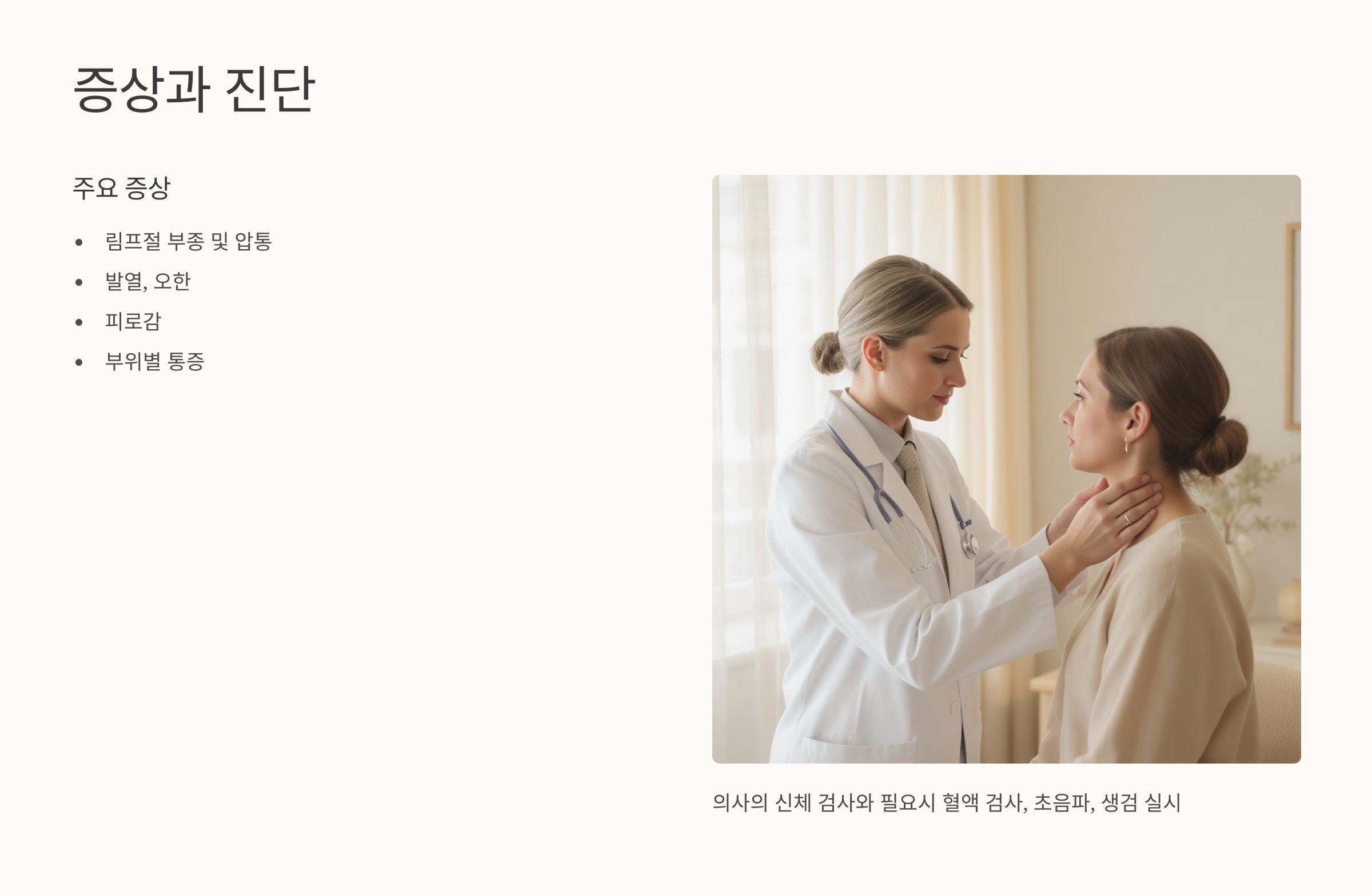 임파선염의 진단은 먼저 자세한 병력 청취와 신체검사로 시작돼요. 의사는 림프절의 크기, 위치, 개수, 단단한 정도, 통증 여부, 움직임 등을 확인해요. 또한 발열, 체중 감소, 야간 발한 같은 전신 증상의 유무도 중요한 단서가 된답니다. 최근 감염 병력, 동물 접촉, 여행력, 약물 복용력 등도 꼼꼼히 확인해요.