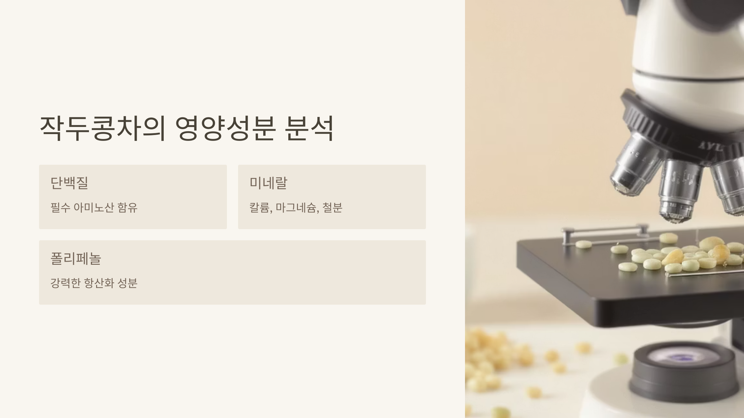 작두콩차에는 정말 다양한 영양성분이 들어있어요. 먼저 단백질 함량이 매우 높아요. 100g당 약 23g의 단백질이 들어있는데, 이는 일반 콩류보다도 높은 수치예요. 특히 필수 아미노산이 균형 있게 들어있어서 영양학적 가치가 높답니다.