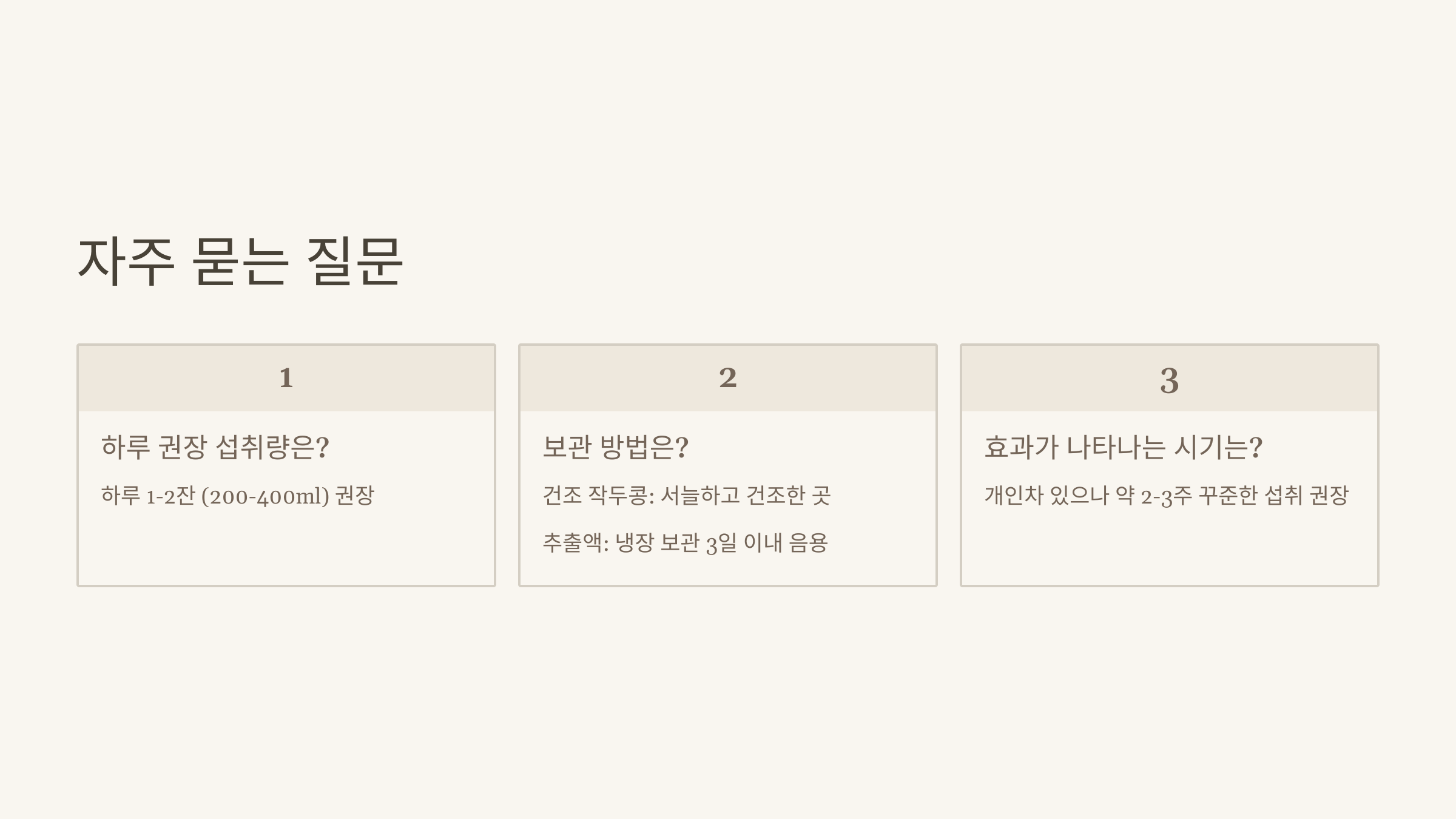 A2. 많은 분들이 비염 개선 효과를 경험했다고 해요. 작두콩의 콘카나 발린 A 성분이 염증을 억제하는 효과가 있거든요. 하지만 개인차가 있고, 즉각적인 효과보다는 꾸준히 마셔야 효과를 볼 수 있어요. 심한 비염은 의사 상담과 함께 보조적으로 활용하는 게 좋답니다.