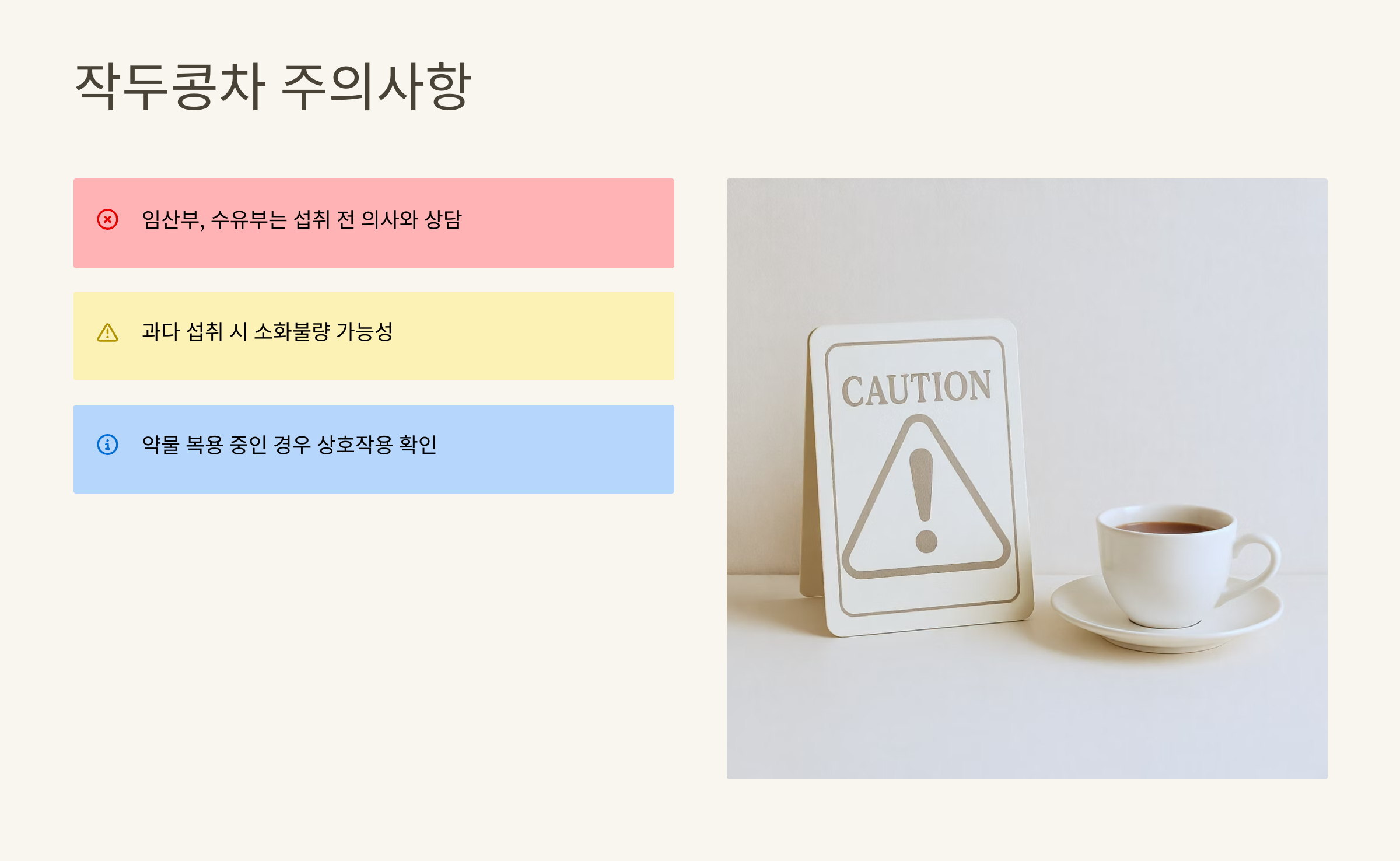 소화기가 약한 분들은 공복에 마시는 걸 피하세요. 작두콩차가 위장을 자극할 수 있어서 속 쓰림이나 복통이 생길 수 있어요. 식후에 마시거나 다른 차와 블렌딩 해서 마시면 부담을 줄일 수 있답니다.