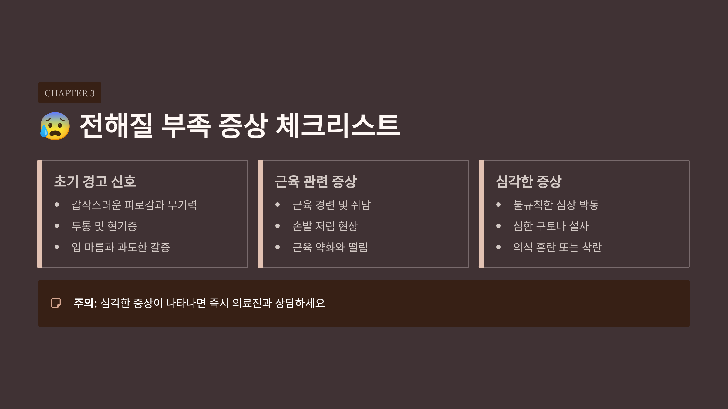 전해질이 부족하면 우리 몸은 다양한 방식으로 신호를 보내요. 처음에는 가벼운 피로감이나 두통으로 시작하지만, 방치하면 심각한 건강 문제로 이어질 수 있답니다. 지금부터 전해질 부족의 주요 증상들을 하나씩 살펴볼게요.