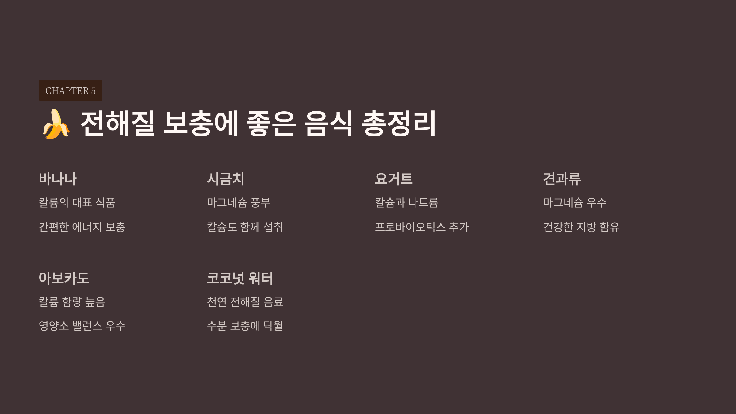 실생활에서는 바나나나 코코넛 워터 같은 자연식품으로 손쉽게 전해질을 보충할 수 있고, 운동할 때는 이온음료 한 병으로 수분과 전해질을 동시에 챙길 수 있어요. 잠을 잘 못 자거나 스트레스를 많이 받는 분들은 마그네슘 보충으로 수면의 질과 정서 안정을 기대할 수 있답니다. 건강한 전해질 균형은 심장, 근육, 신경계 전체의 원활한 작동을 도와서 더 활기차고 건강한 하루를 보낼 수 있게 해 줘요!