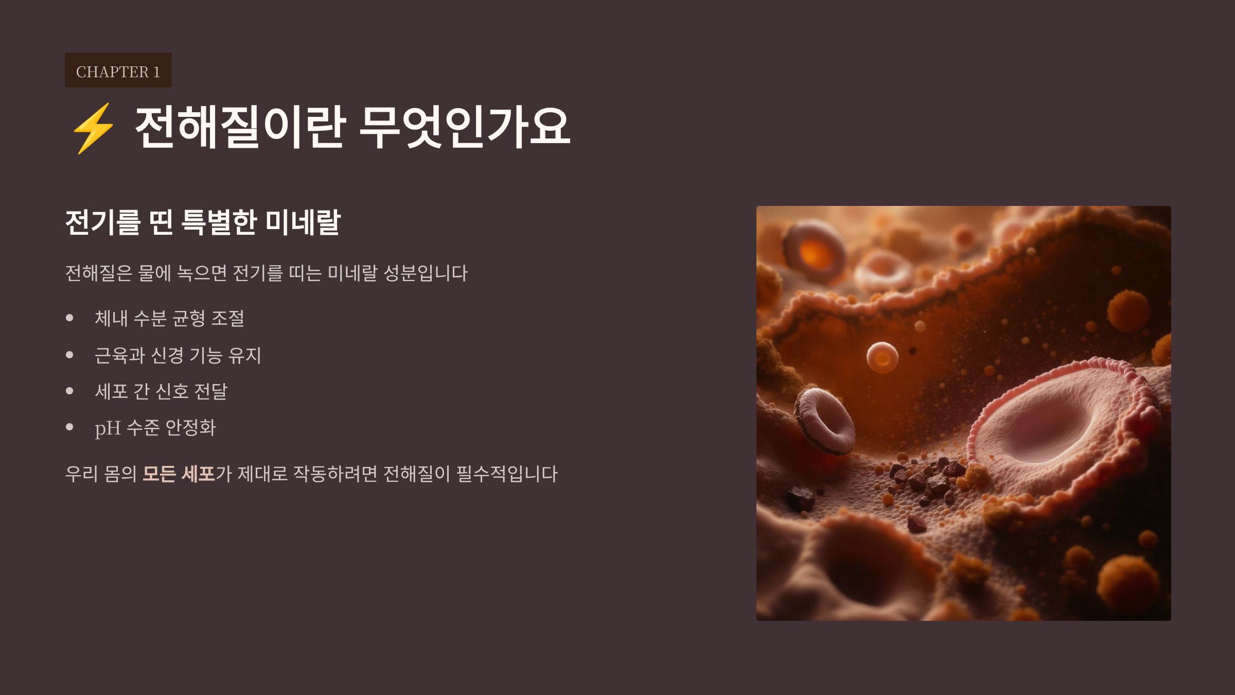 내가 생각했을 때 전해질의 가장 놀라운 점은 아주 적은 양으로도 우리 몸 전체의 기능에 영향을 미친다는 거예요. 예를 들어 심장이 규칙적으로 박동하는 것도, 근육이 수축하고 이완하는 것도, 뇌에서 신경 신호가 전달되는 것도 모두 전해질 덕분이에요. 마치 전기 회로에서 전류가 흐르듯이 전해질이 우리 몸의 전기적 신호를 원활하게 전달해 주는 거죠.