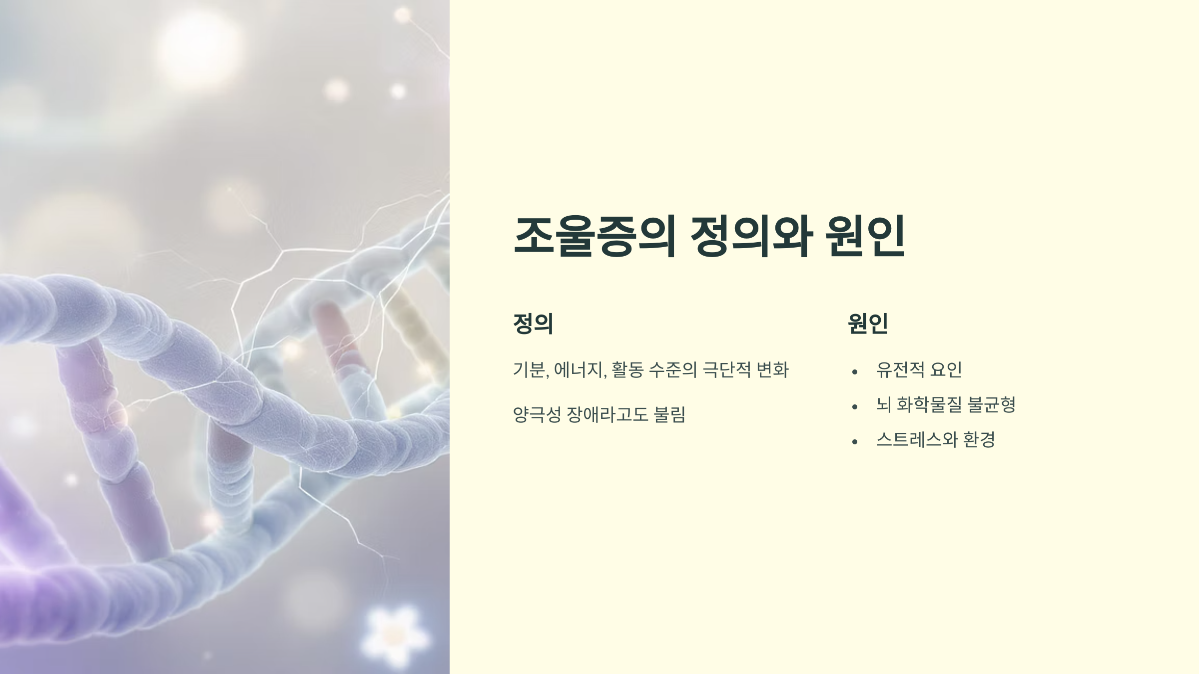 조울증은 뇌의 신경전달물질 불균형으로 인해 발생하는 기분장애예요. 세로토닌, 도파민, 노르에피네프린 같은 신경전달물질의 이상이 주요 원인으로 알려져 있답니다. 이러한 화학물질의 불균형은 뇌의 감정 조절 중추에 영향을 미쳐 극단적인 기분 변화를 일으켜요. 최근 연구에서는 뇌의 전두엽과 변연계의 기능 이상도 조울증 발병과 관련이 있다고 밝혀졌어요.