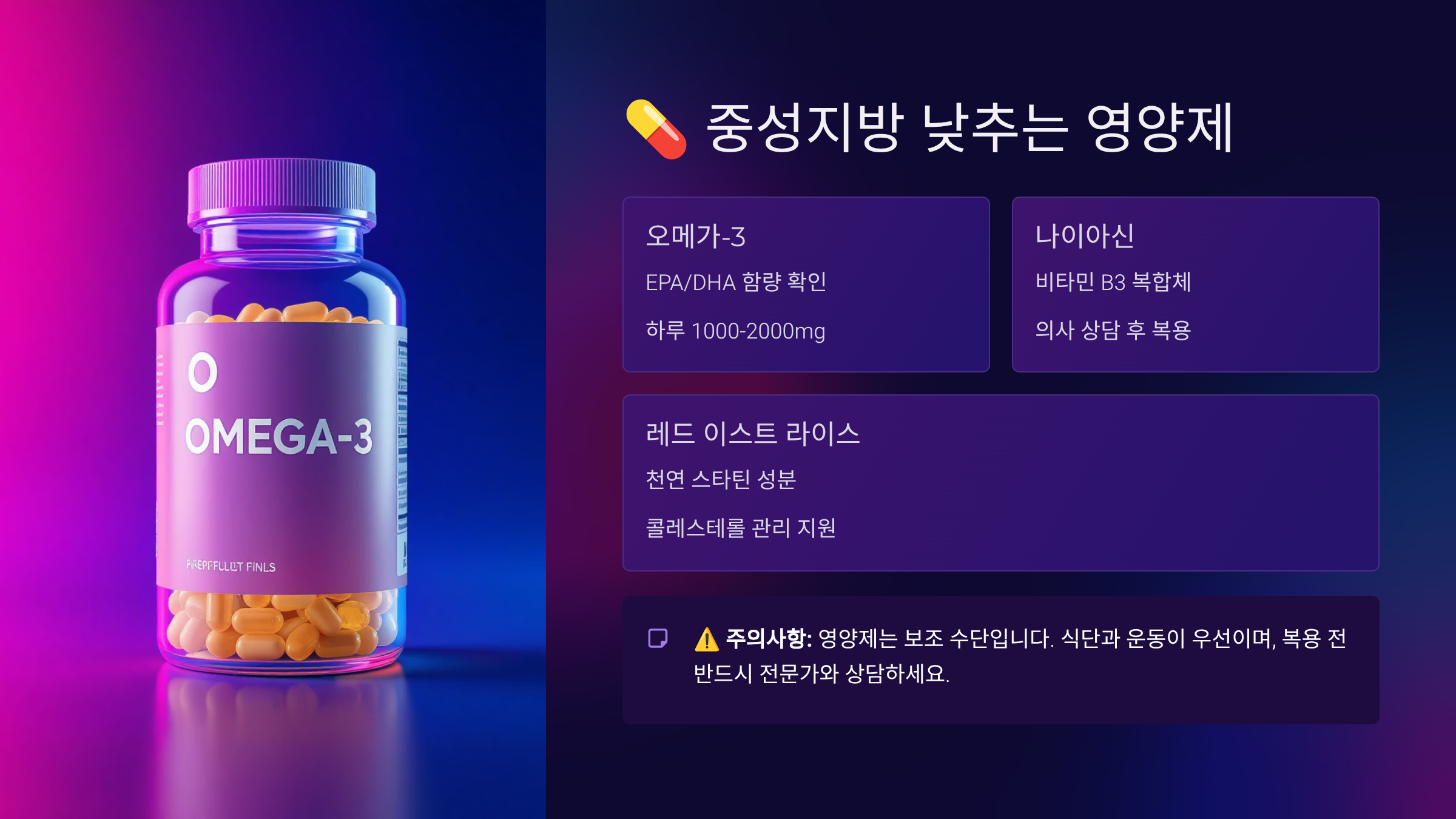 오메가 3은 중성지방 감소에 가장 효과적인 영양제예요. EPA와 DHA 함량이 높은 제품을 선택하세요. 하루 2~4g 섭취하면 중성지방을 20~30% 낮출 수 있어요. 식사와 함께 복용하면 흡수율이 높아지고, 비린내가 나는 트림도 줄일 수 있어요.