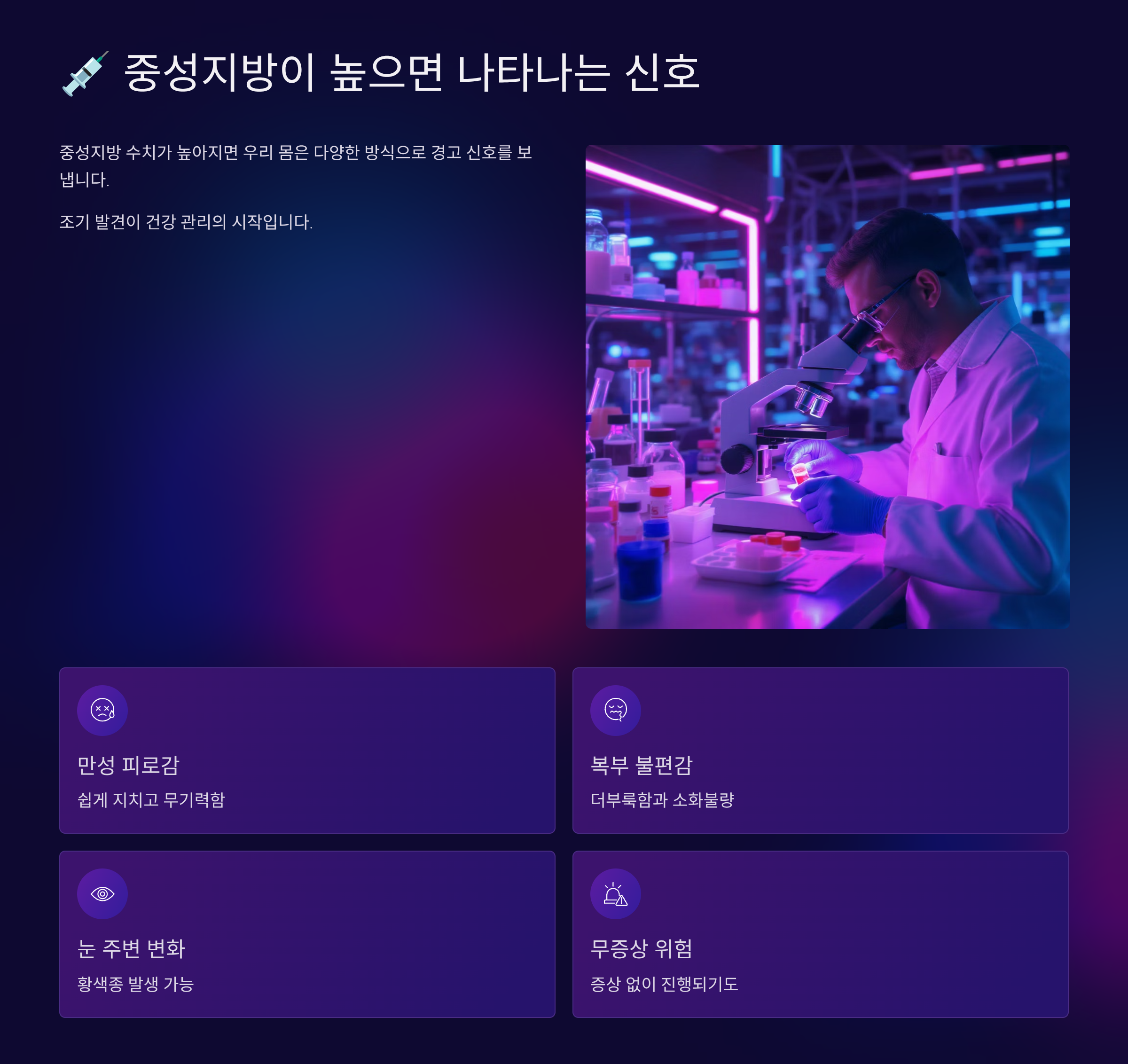 이 글의 정보는 일반적인 건강 정보 제공을 목적으로 하며, 의학적 조언을 대체할 수 없습니다. 개인의 건강 상태는 각자 다르므로, 중성지방 관리와 관련된 구체적인 진단과 치료는 반드시 의료 전문가와 상담하시기 바랍니다.