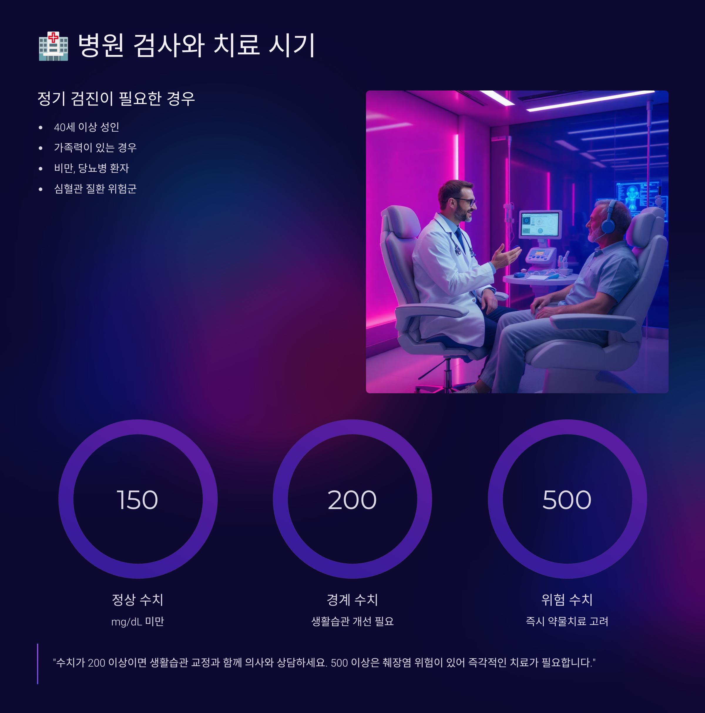 중성지방이 200mg/dL을 넘으면 병원 진료를 받아야 해요. 특히 500mg/dL 이상이면 즉시 치료를 시작해야 급성 췌장염을 예방할 수 있어요. 가족력이 있거나 당뇨병, 고혈압이 있다면 더 적극적인 관리가 필요해요. 정기적인 모니터링으로 합병증을 예방하세요.