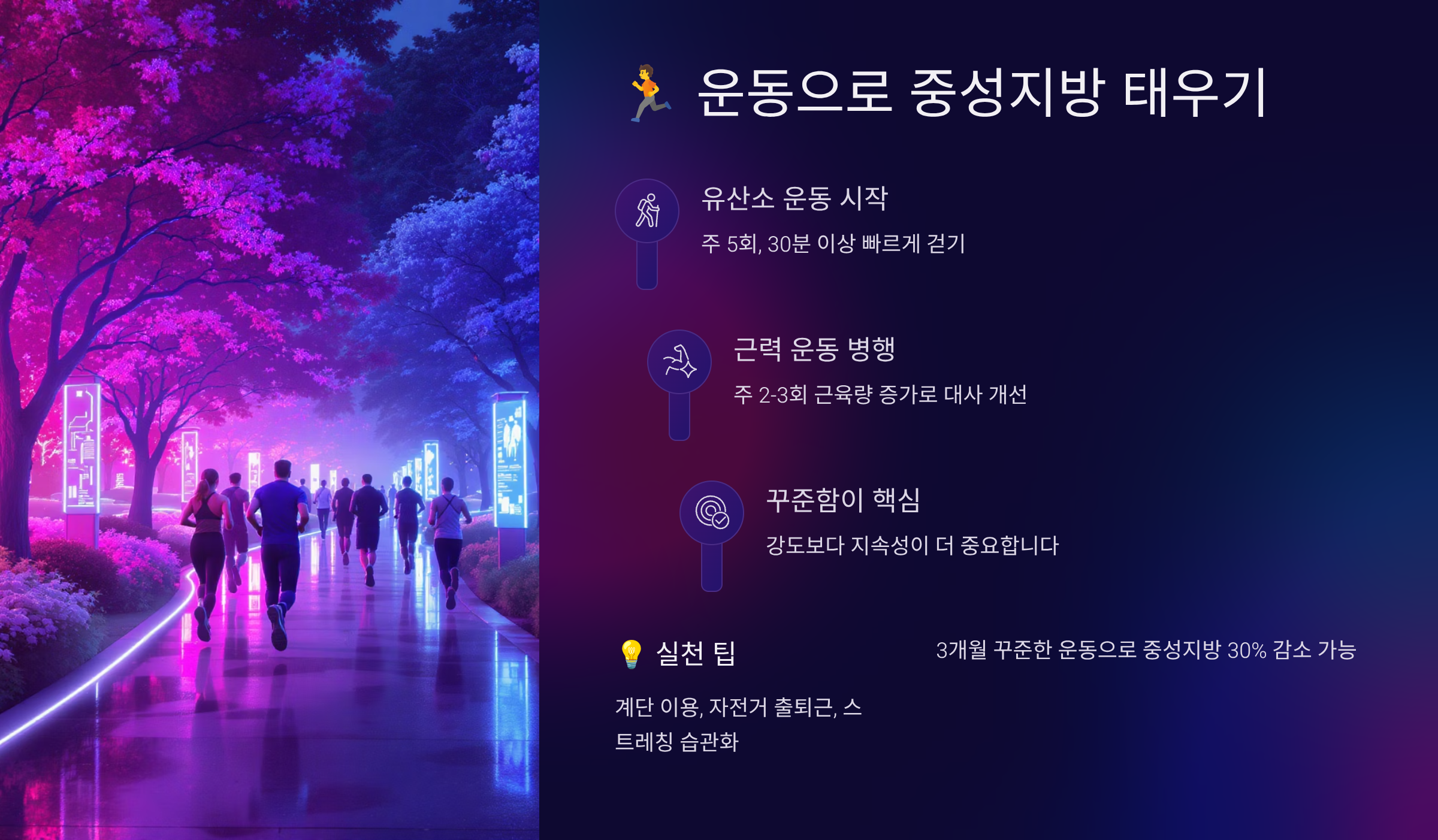 운동은 중성지방을 낮추는 가장 확실한 방법 중 하나예요. 유산소 운동을 주 5회, 하루 30분 이상 하면 중성지방이 20~30% 감소해요. 빠르게 걷기, 조깅, 수영, 자전거 타기가 효과적이에요. 운동 강도는 옆 사람과 대화가 가능한 정도가 적당해요.