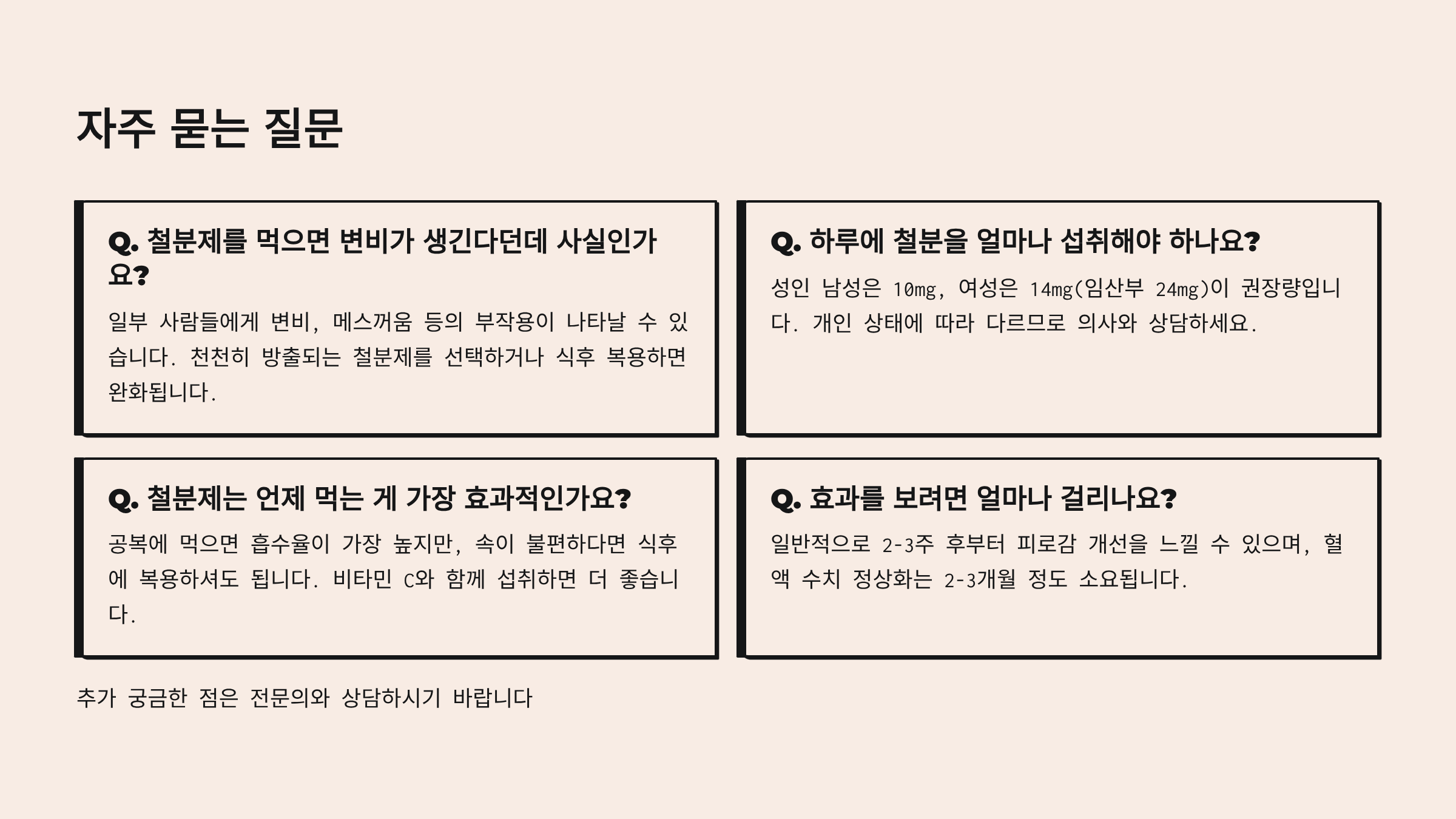 A5. 변비, 메스꺼움, 복통, 검은색 변이 흔한 부작용이에요. 킬레이트 형태나 리포좀 철분 제품은 부작용이 적을 수 있어요. 심한 부작용이 있다면 의사와 상담하세요.