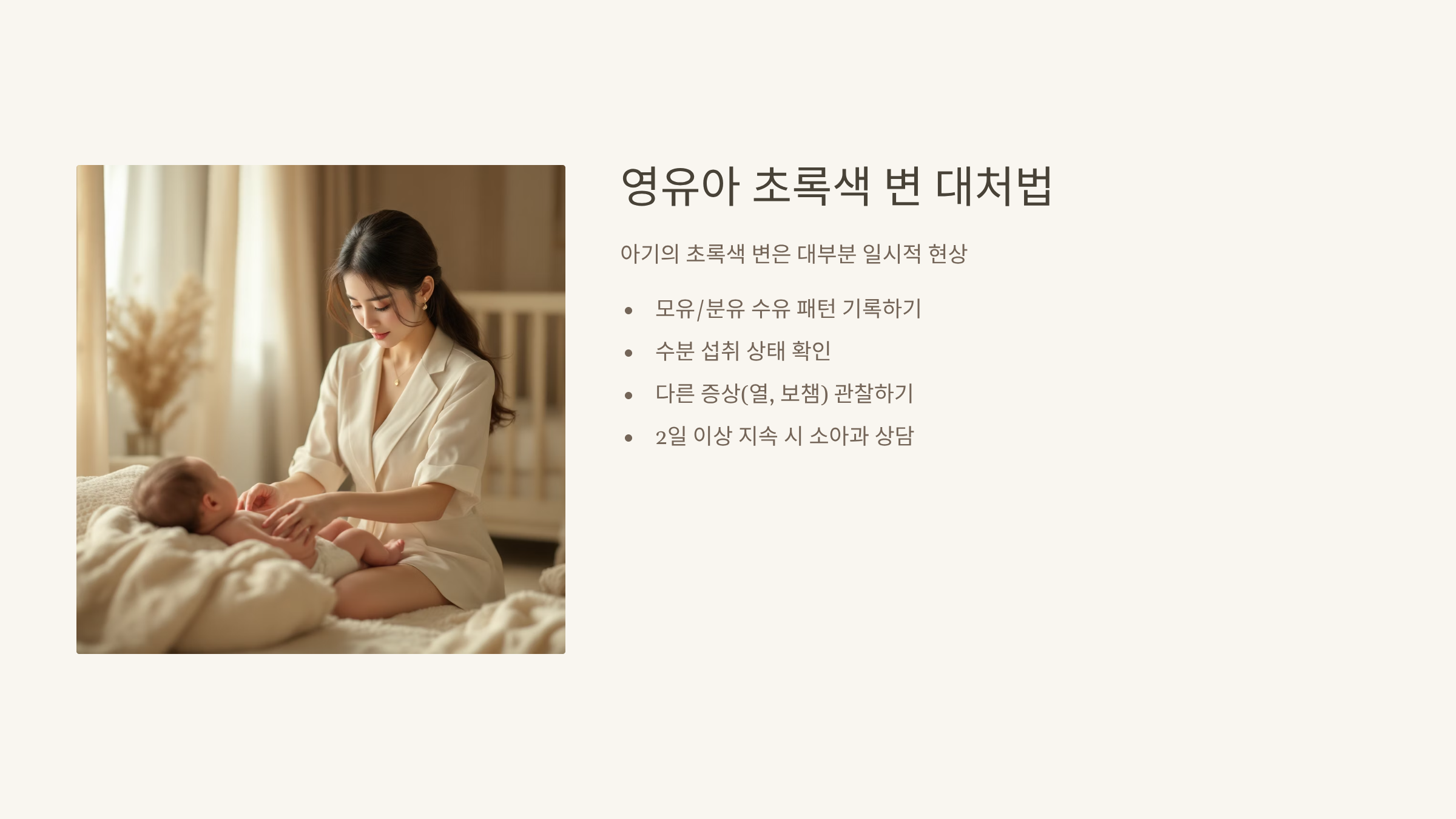 부모님들이 주의해야 할 신호들이 있어요. 초록색 변과 함께 아기가 보채거나, 체중이 늘지 않거나, 발열이 있거나, 혈변이 섞여 나온다면 즉시 소아과를 방문해야 해요. 특히 신생아의 경우 담도 폐쇄증 같은 심각한 질환의 신호일 수 있으므로 주의 깊게 관찰해야 해요. 하지만 대부분의 초록색 변은 정상적인 변화이므로 너무 걱정하지 마세요. 👶