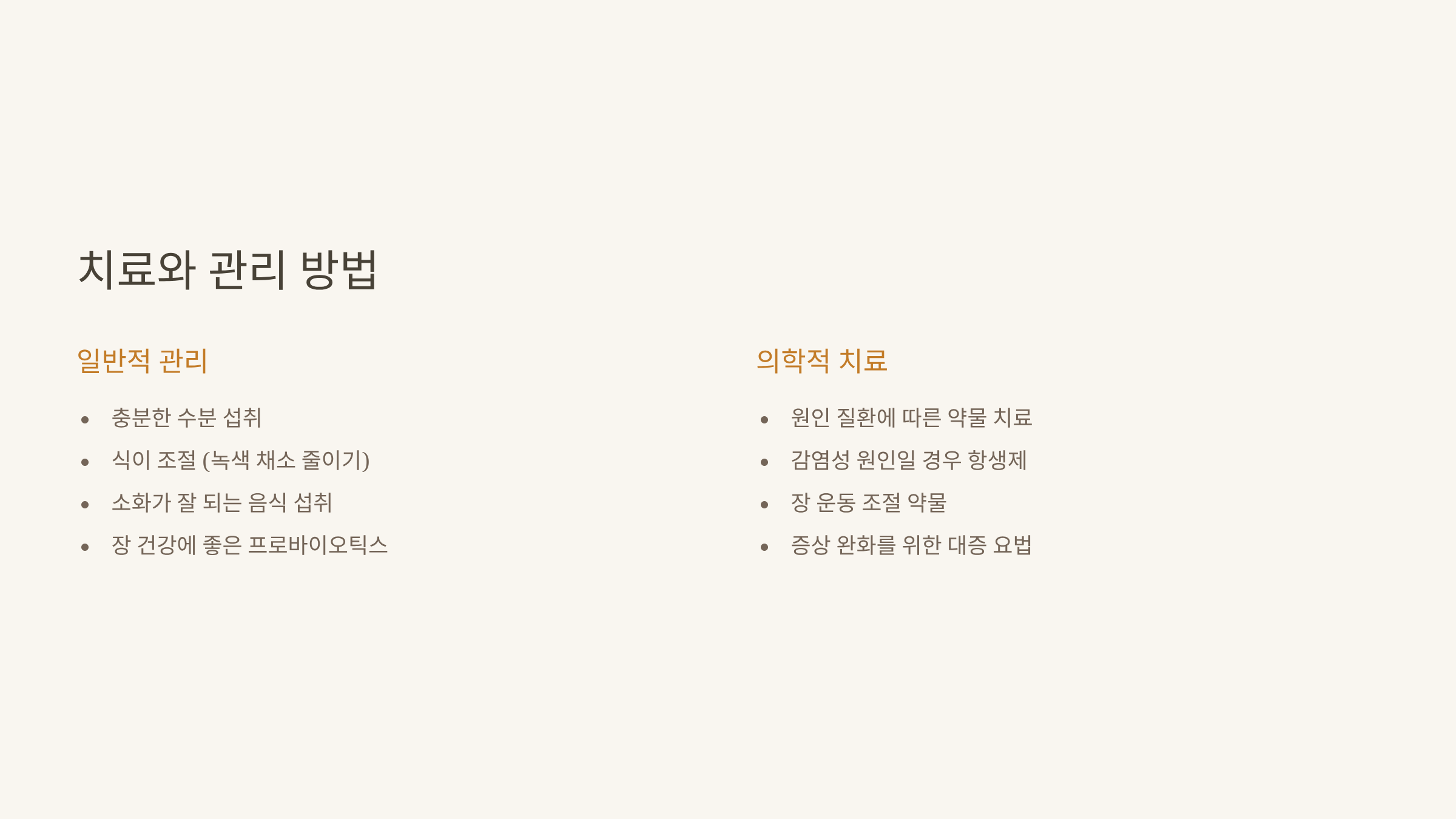 식이 조절은 가장 기본적인 관리 방법이에요. 초록색 변을 유발하는 음식을 일시적으로 피하고, 소화가 잘 되는 음식 위주로 섭취해요. 백미죽, 바나나, 토스트 같은 BRAT 식단이 도움이 될 수 있어요. 기름진 음식, 매운 음식, 카페인, 알코올은 피하는 것이 좋아요. 식사는 소량씩 자주 하는 것이 소화에 부담을 줄여줘요.