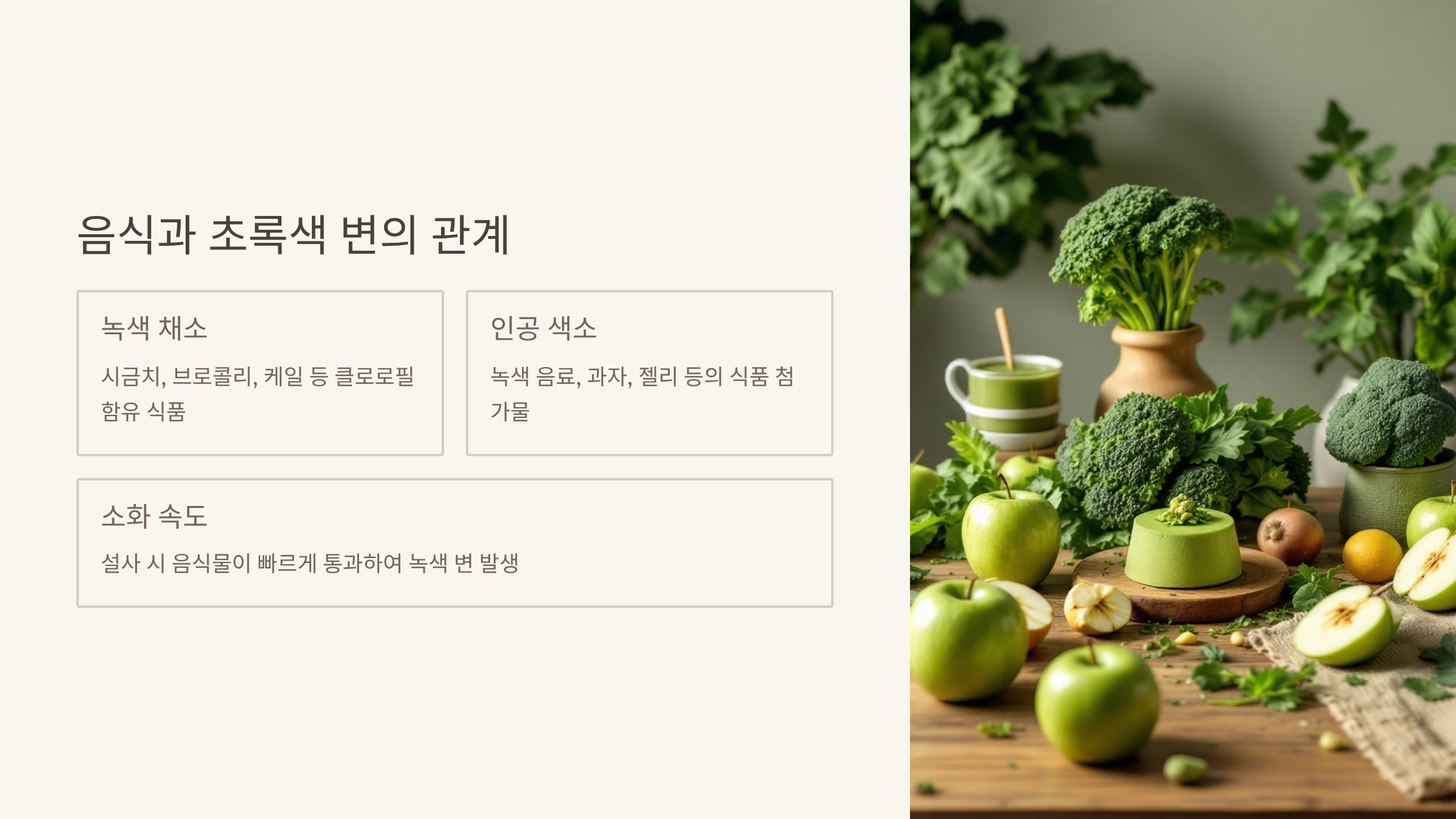 음식은 변의 색깔을 결정하는 가장 직접적인 요인이에요. 특히 엽록소가 풍부한 녹색 채소들은 초록색 변의 가장 흔한 원인이 되죠. 시금치를 예로 들면, 100g당 약 12mg의 엽록소를 함유하고 있어요. 이 엽록소는 소화 과정에서 완전히 분해되지 않고 일부가 그대로 배출되면서 변을 초록색으로 만들어요. 케일, 근대, 청경채 같은 채소들도 비슷한 효과를 나타낸답니다.