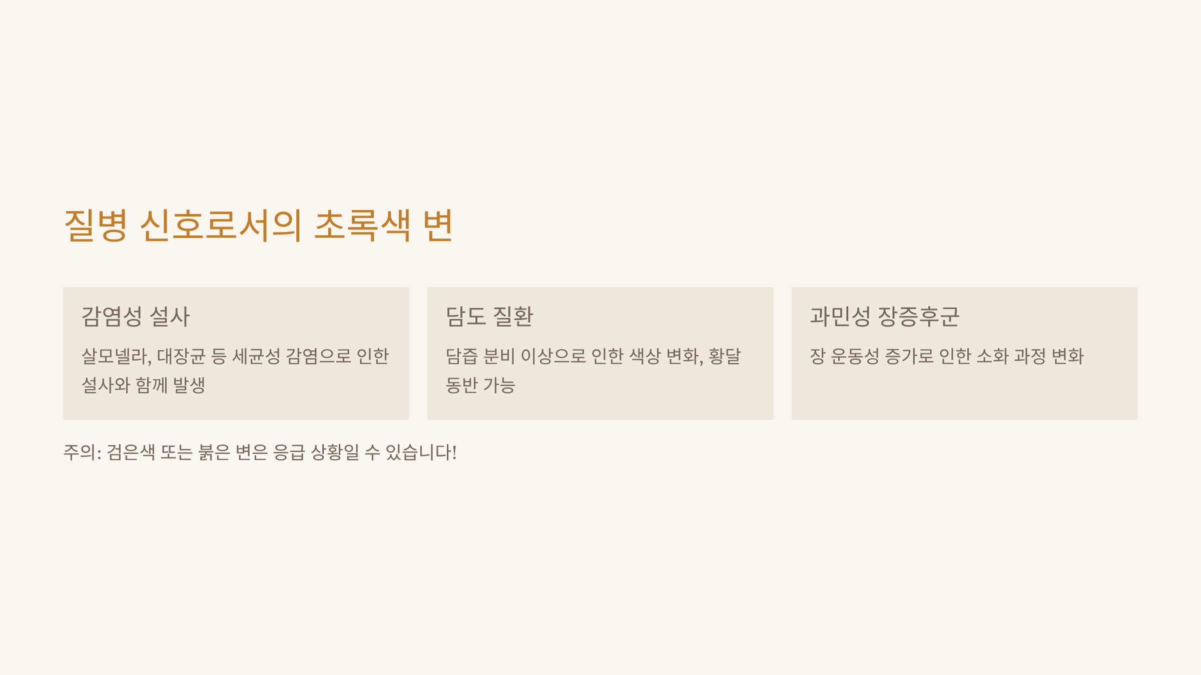 초록색 변이 질병의 신호일 수 있는 경우들이 있어요. 가장 흔한 것은 감염성 장염이에요. 살모넬라, 대장균, 지아르디아 같은 세균이나 기생충에 감염되면 심한 설사와 함께 초록색 변이 나타날 수 있어요. 이런 감염은 오염된 음식이나 물을 통해 전파되는데, 특히 여행 중이나 위생 상태가 좋지 않은 곳에서 음식을 먹었을 때 발생하기 쉬워요.