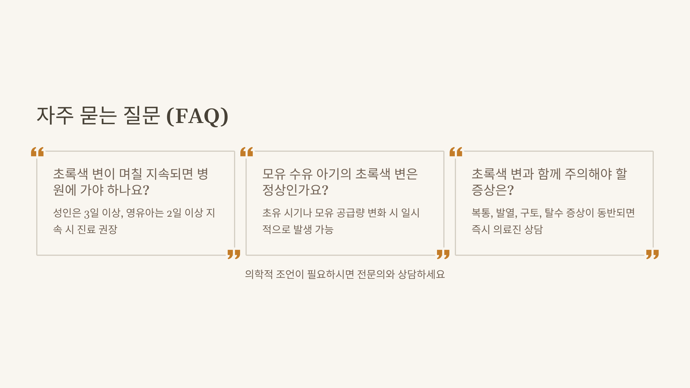 A2. 모유 수유 중인 아기의 초록색 변은 대부분 정상이에요. 특히 생후 첫 몇 개월은 변의 색이 자주 바뀔 수 있어요. 아기가 잘 먹고, 체중이 정상적으로 늘고, 활발하다면 걱정하지 않아도 돼요. 다만 아기가 보채거나, 먹지 않거나, 발열이 있다면 소아과 진료를 받아보세요.