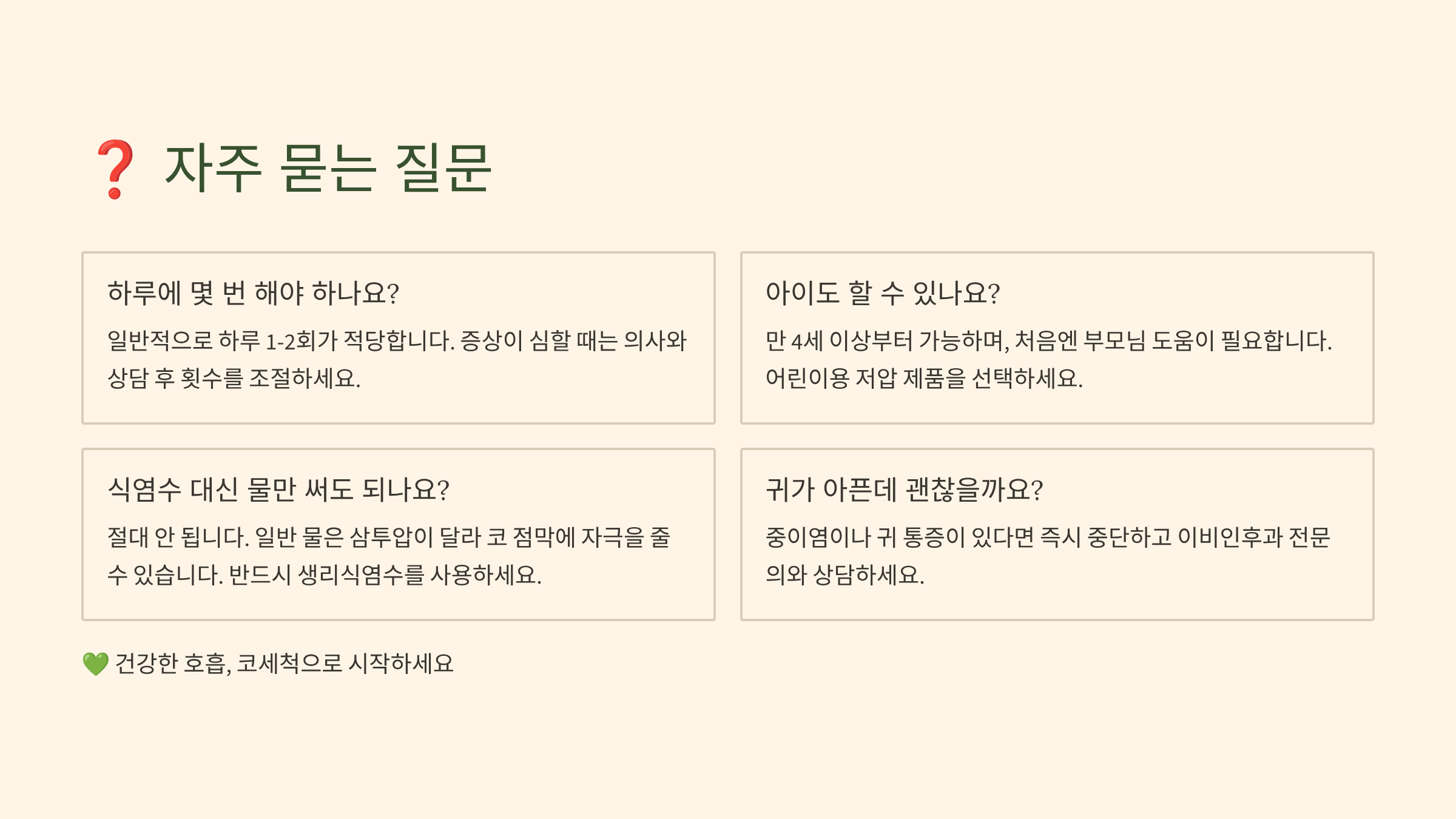 코세척 빈도는 하루 1~2회가 적당해요. 아침 기상 후와 저녁 취침 전이 가장 효과적이죠. 미세먼지가 심한 날이나 알레르기 시즌에는 3회까지 늘려도 괜찮아요. 하지만 너무 자주 하면 코 점막이 건조해질 수 있으니 적절한 빈도를 유지하는 것이 중요해요.