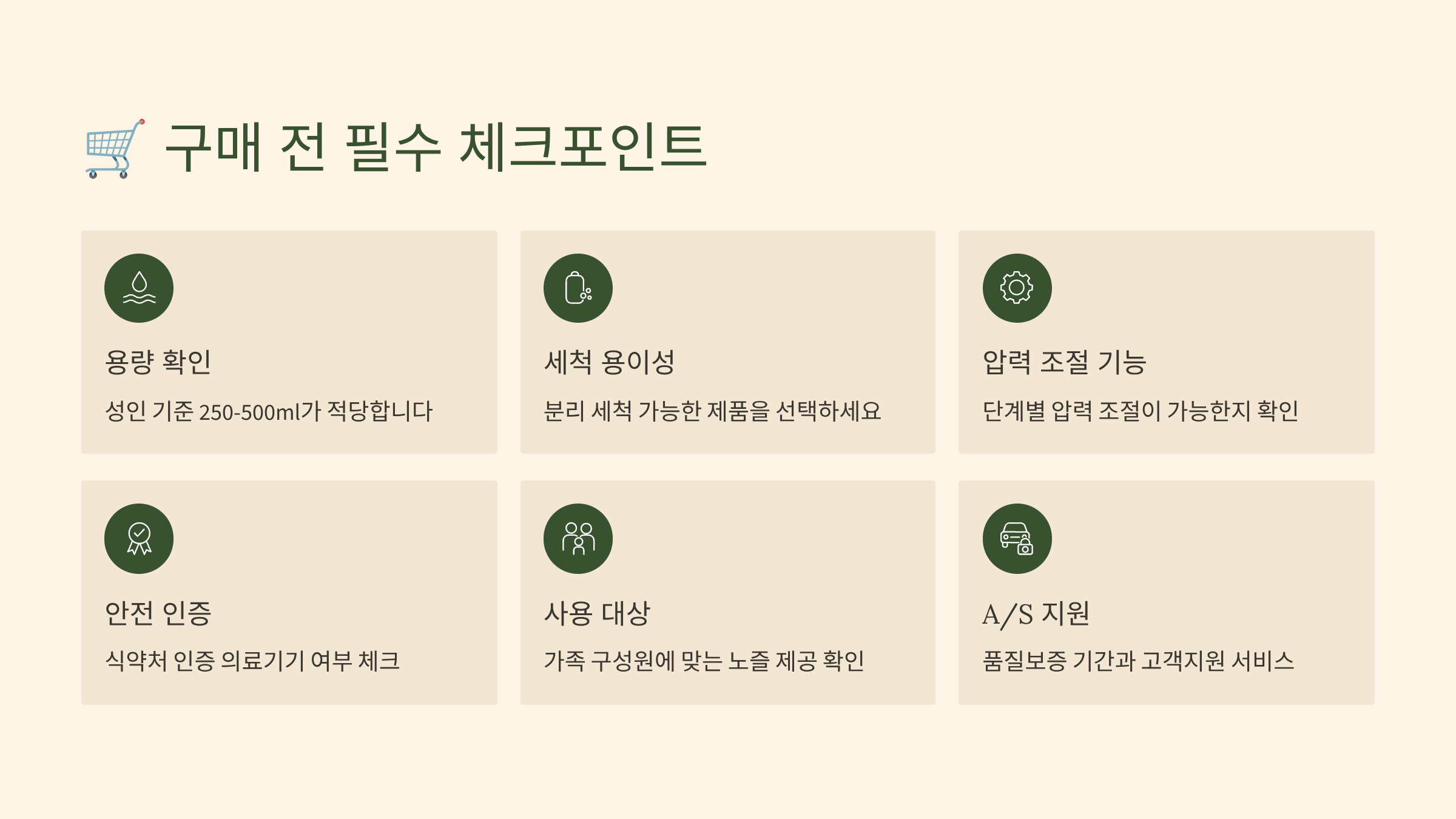 용량과 크기도 고려하세요. 한 번 세척에 보통 200~250ml 정도가 필요한데, 너무 작은 용량은 중간에 다시 채워야 해서 불편해요. 반대로 너무 크면 무겁고 다루기 어려워요. 손 크기와 악력을 고려해서 적당한 크기를 선택하는 것이 중요해요.