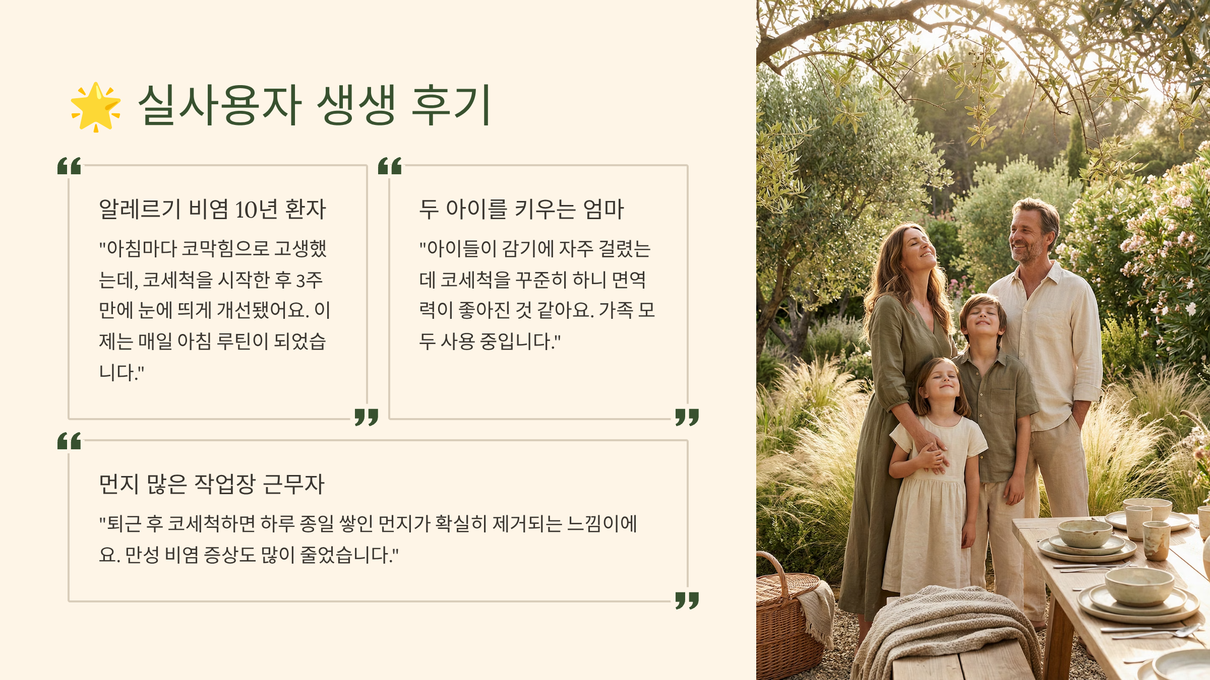 간호사 최 모 씨는 "병원에서 환자들에게 권하던 코세척을 직접 해보니 정말 좋더라고요"라고 해요. 특히 코로나19 시기에 매일 코세척을 하면서 건강을 지킬 수 있었대요. 동료들에게도 적극 추천하고 있으며, 이제는 가족 모두가 사용한다고 하네요.